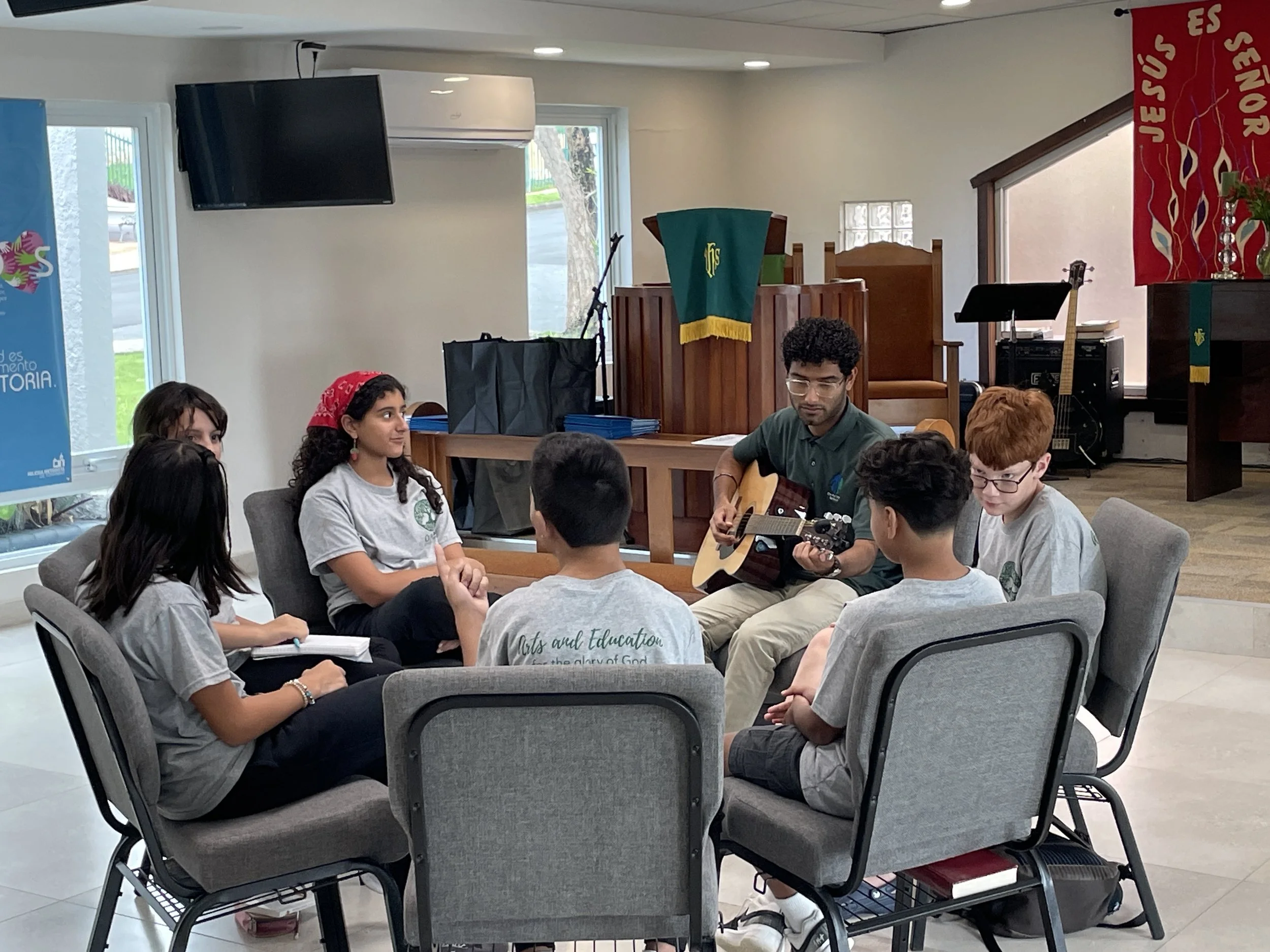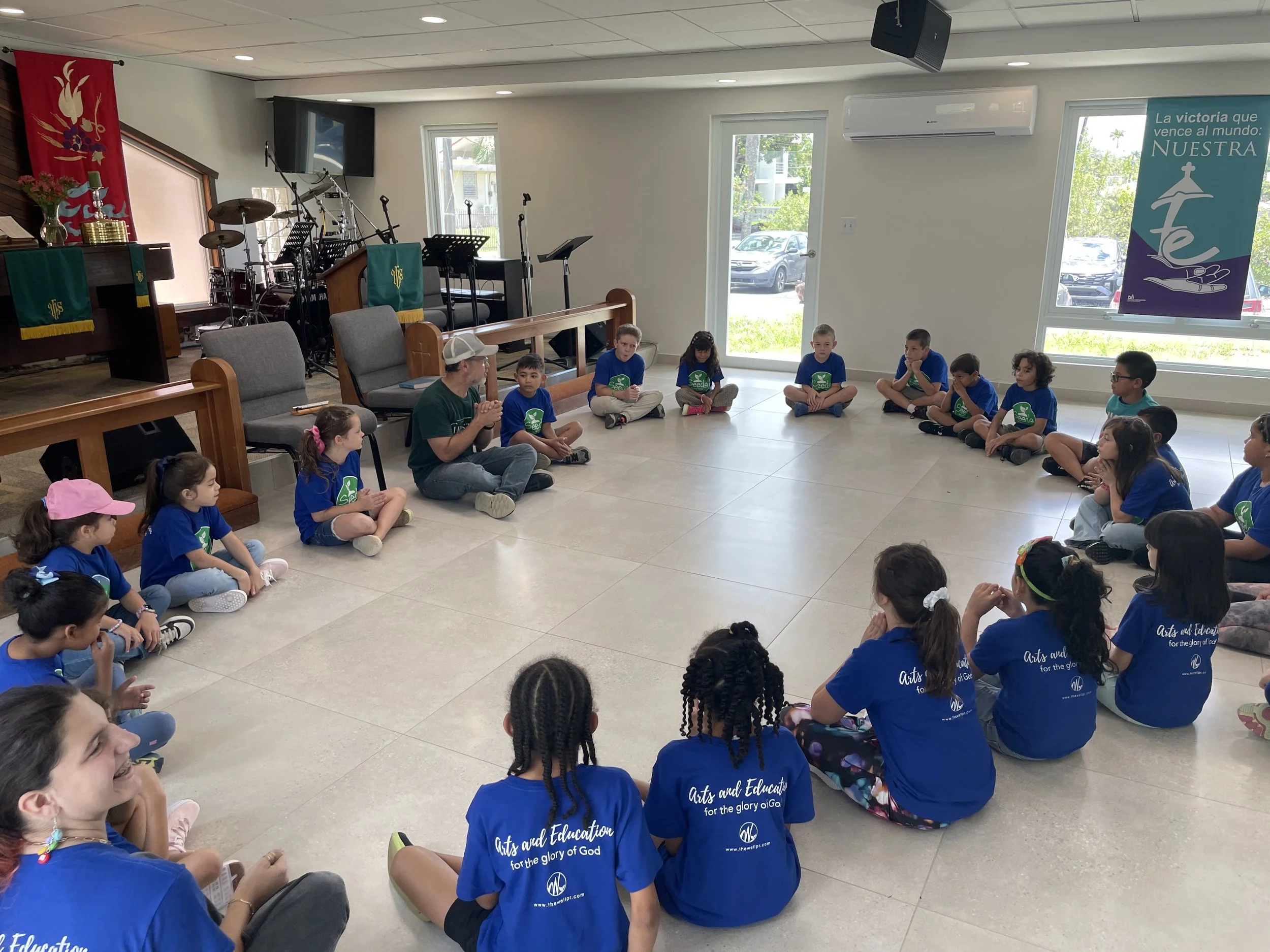The children came in early and were so happy to hang up their backpacks and start playing with the activities that were set up for them. The parents were invited to stay with us during our time of worship, where we discussed what we do during our worship time and how we do it; it is a time to sing, pray, and learn more about God through His Word. We sang a song of thanksgiving with instruments called “Dios ha sido tan bueno conmigo” where the kids were able to say what they are thankful for and began learning a song with the words from Genesis 1:1. This week we will learn about the days of Creation.