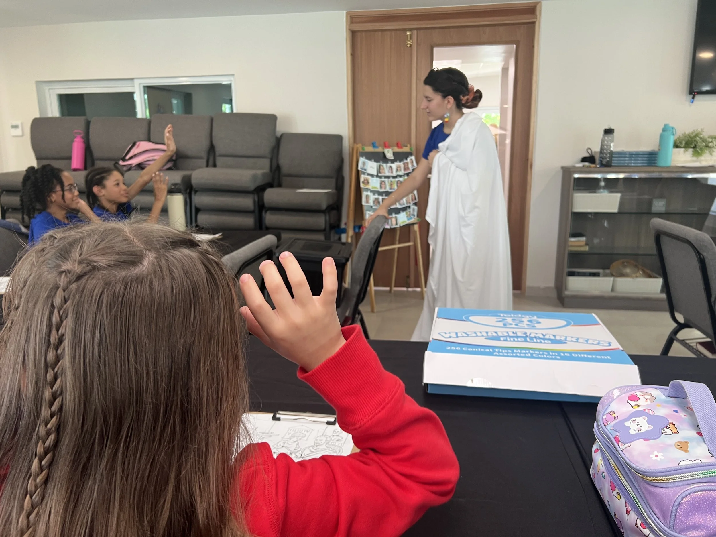 We jumped right into our Time Machine (singing our song, of course) and learned what it was like for kids to go to school in Ancient Rome. We had a visitor named Claudia (who looked just like Miss Olivia, our helper) and she told us a little about the culture of Rome, how people got their names, what family life was like, etc. It was great to see the kids ask her questions about her life. We were particularly impressed with her Roman clothes, which we learned were called tunicas and togas.
