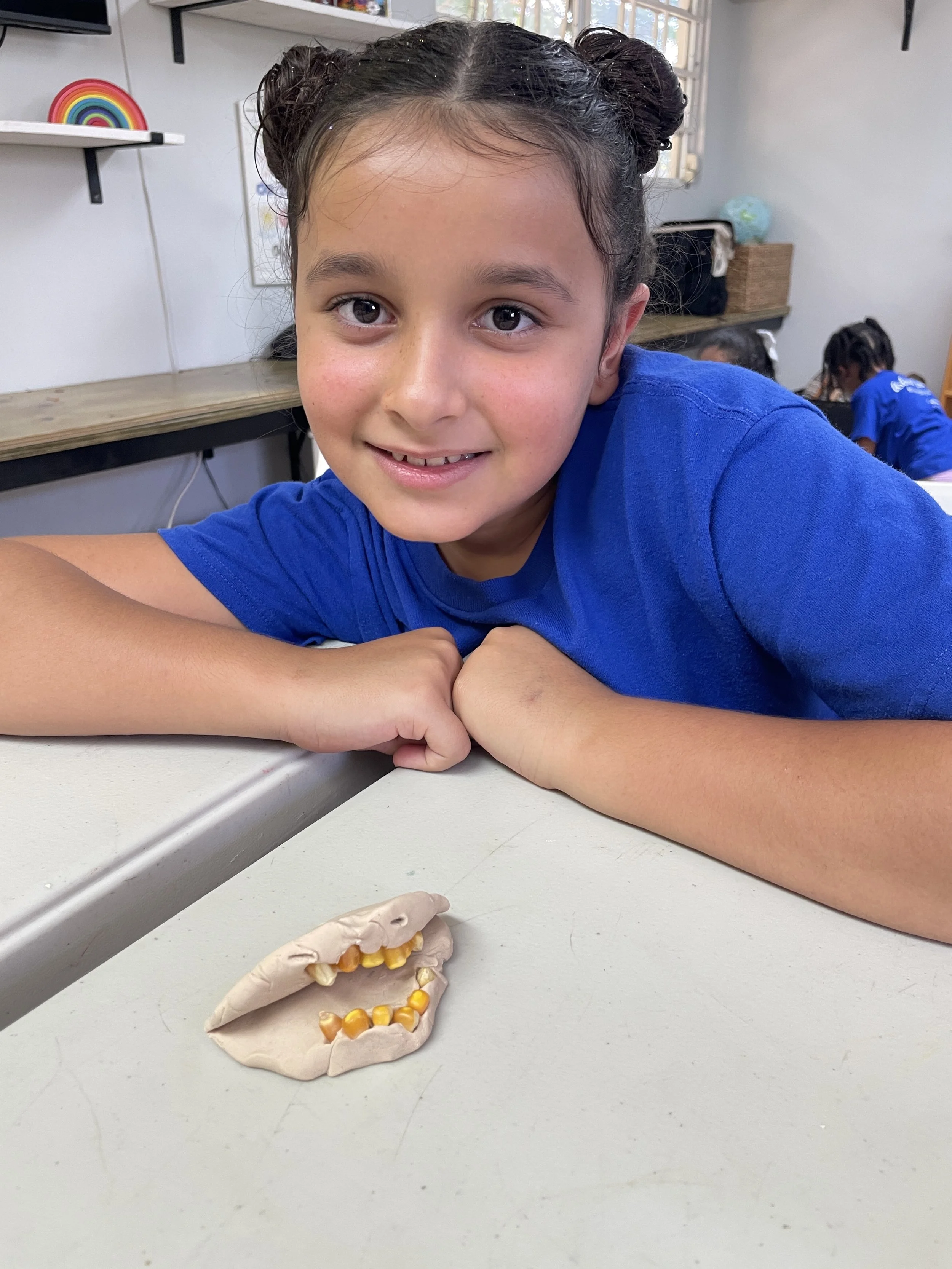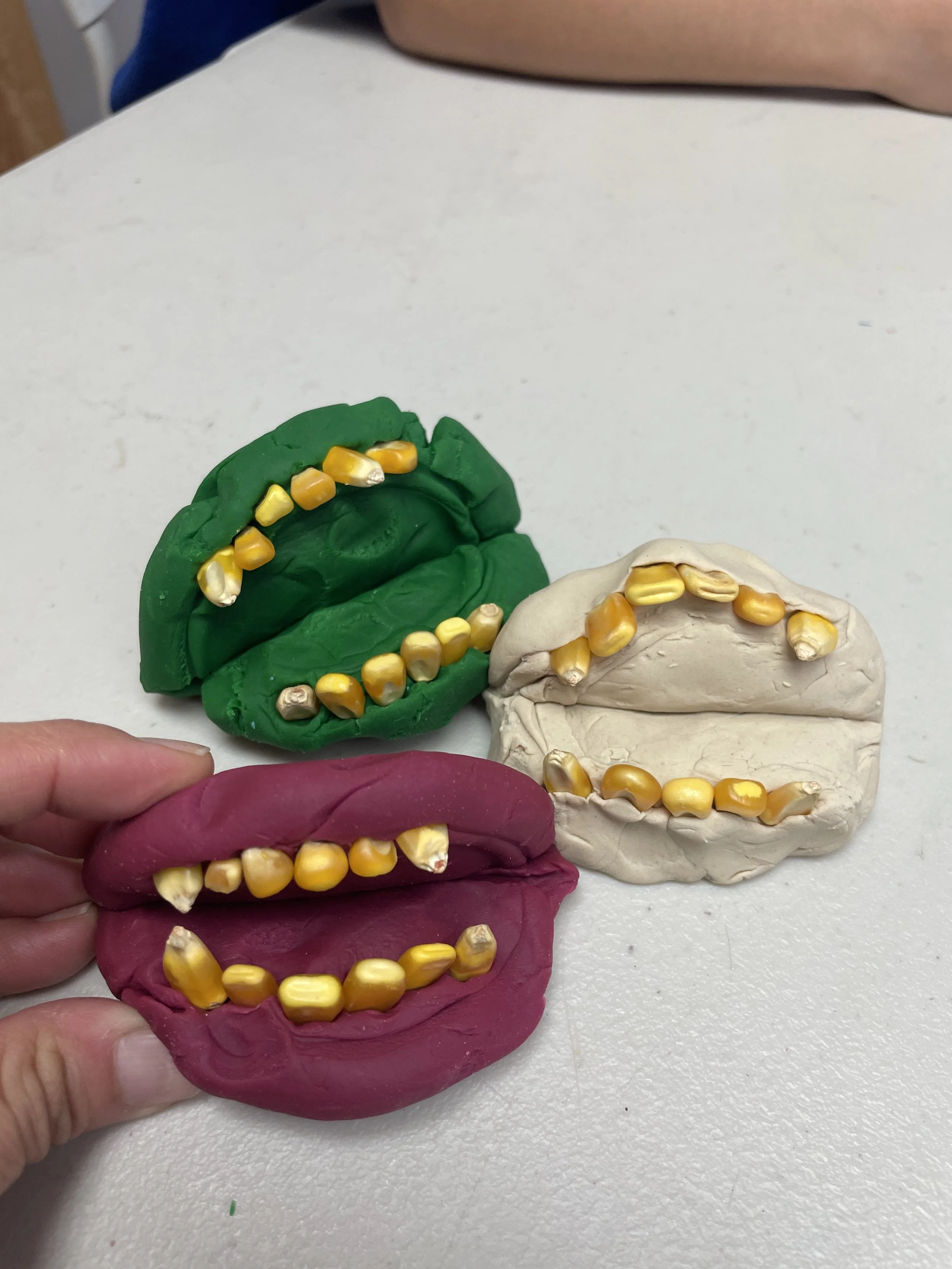 After learning about bones and the skeleton, I asked the students, “What is stronger than bone?” After a few tries, they eventually guessed the answer: teeth. Although many people think that teeth are bones, teeth, unlike bones, are not alive. We learned that teeth are covered by a strong coat called enamel and that only diamonds are stronger than enamel. The enamel protects the living part inside of the tooth. Because they cannot repair themselves like bones can, we need to protect our teeth very well, especially our second teeth. The kids shared different stories about how they lost their teeth and we began to learn about the different types of teeth and what the purpose of them is.