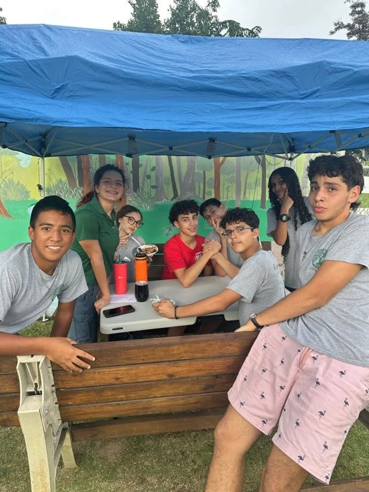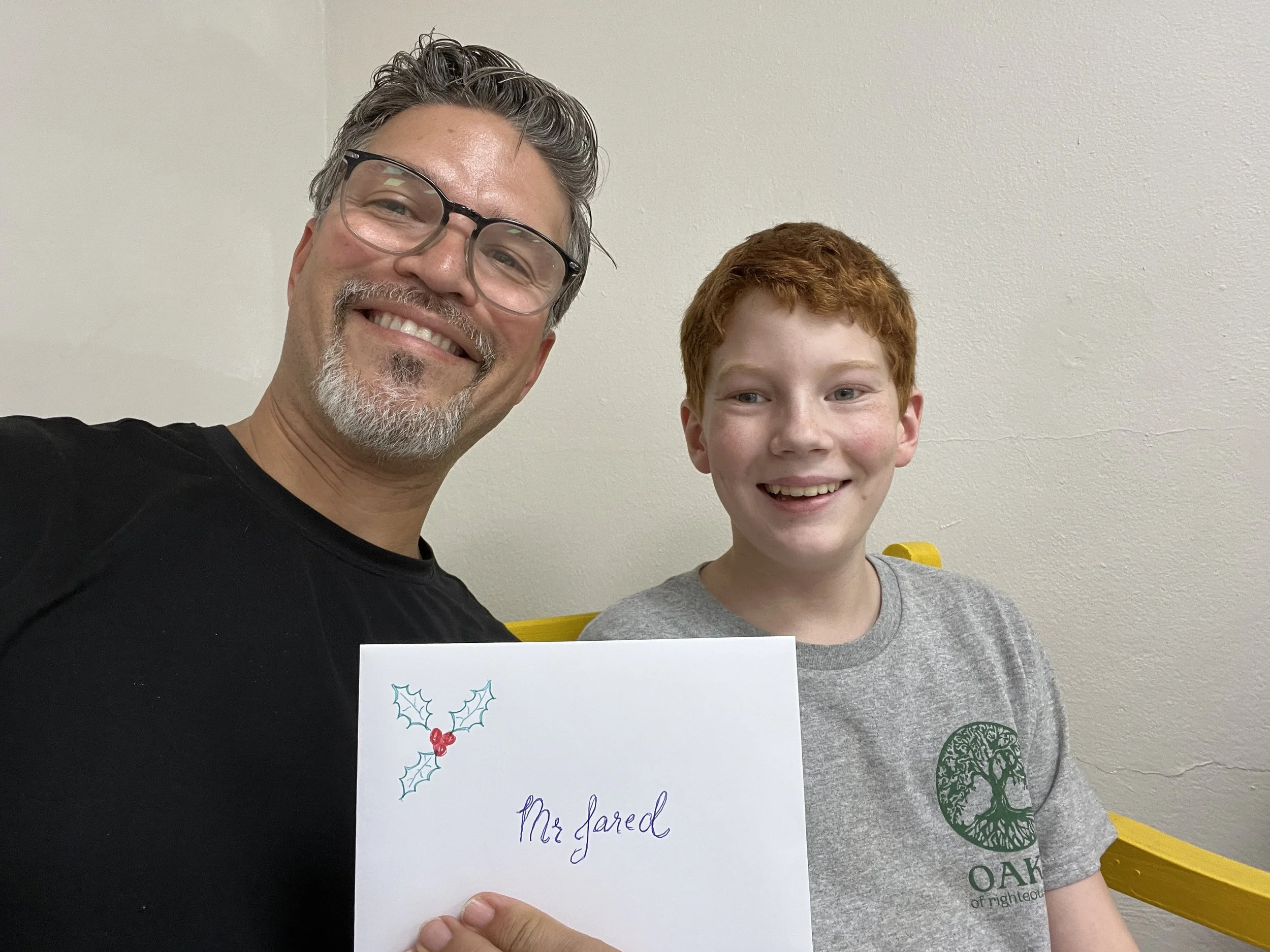 We held our end of the semester party in the OAKS program which included our third “Bible-Bee” of the year. These “bees” are times for the Oaks Students to demonstrate their memorization of the verses we have learned so far in the class. In the photo, Finn and I pose with one of the lovely cards he gave to his teachers.