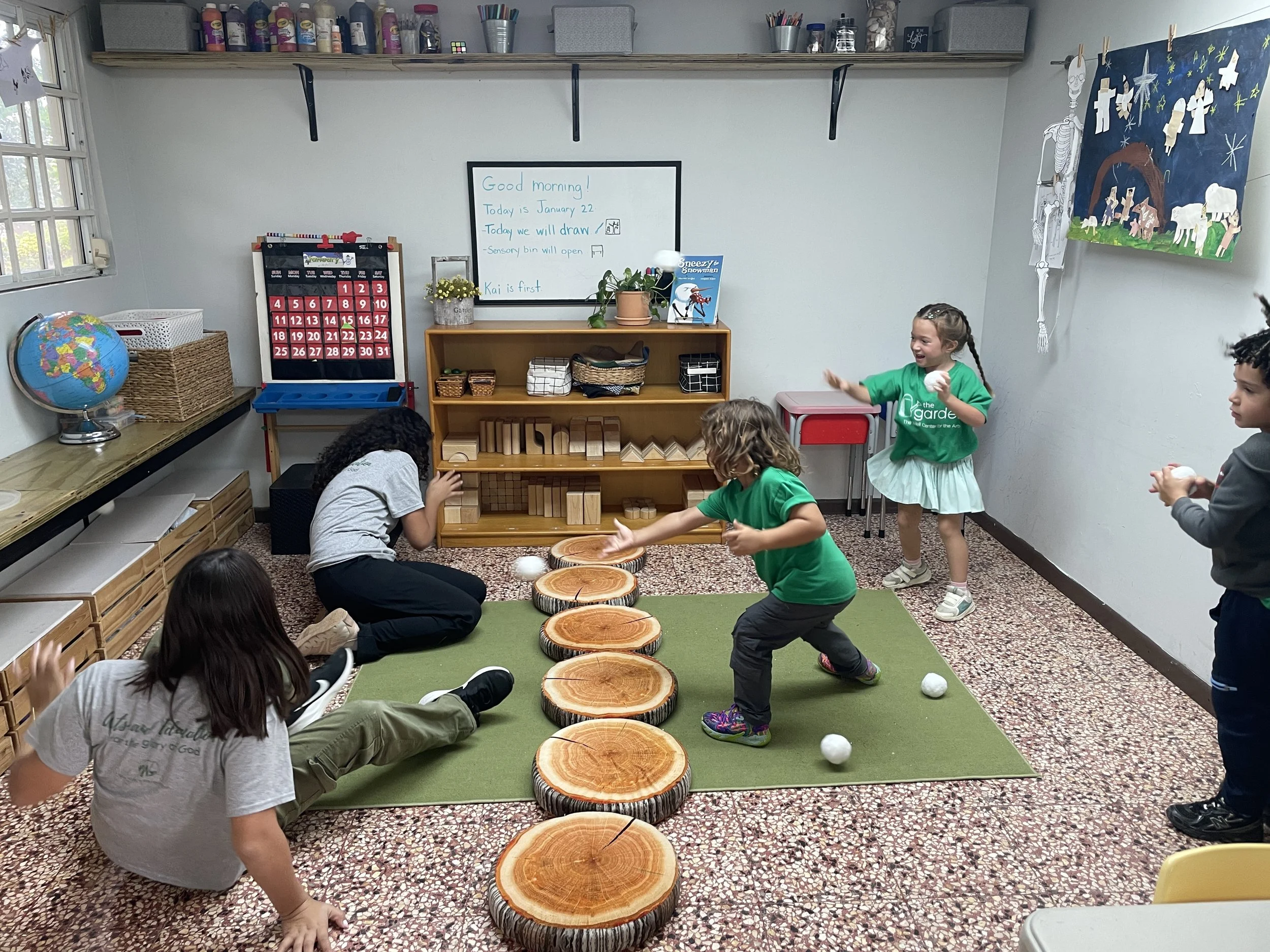 For our activity time we enjoyed playing more with the snow from last week and made a different kind of sensory bin play using lavender scented epsom salt and some fun crystals and mini penguins. When Emmanuel smelled the salt he exclaimed, “huele espectacular!” Since the rain kept us inside, we got to play a game with our plush snowballs! The kids had to work hard to keep the snow out of their zone for thirty seconds. When the timer went off, we counted how many snowballs were on each side and the side that had the least was the winner. Emma and Carolina joined in on the fun.