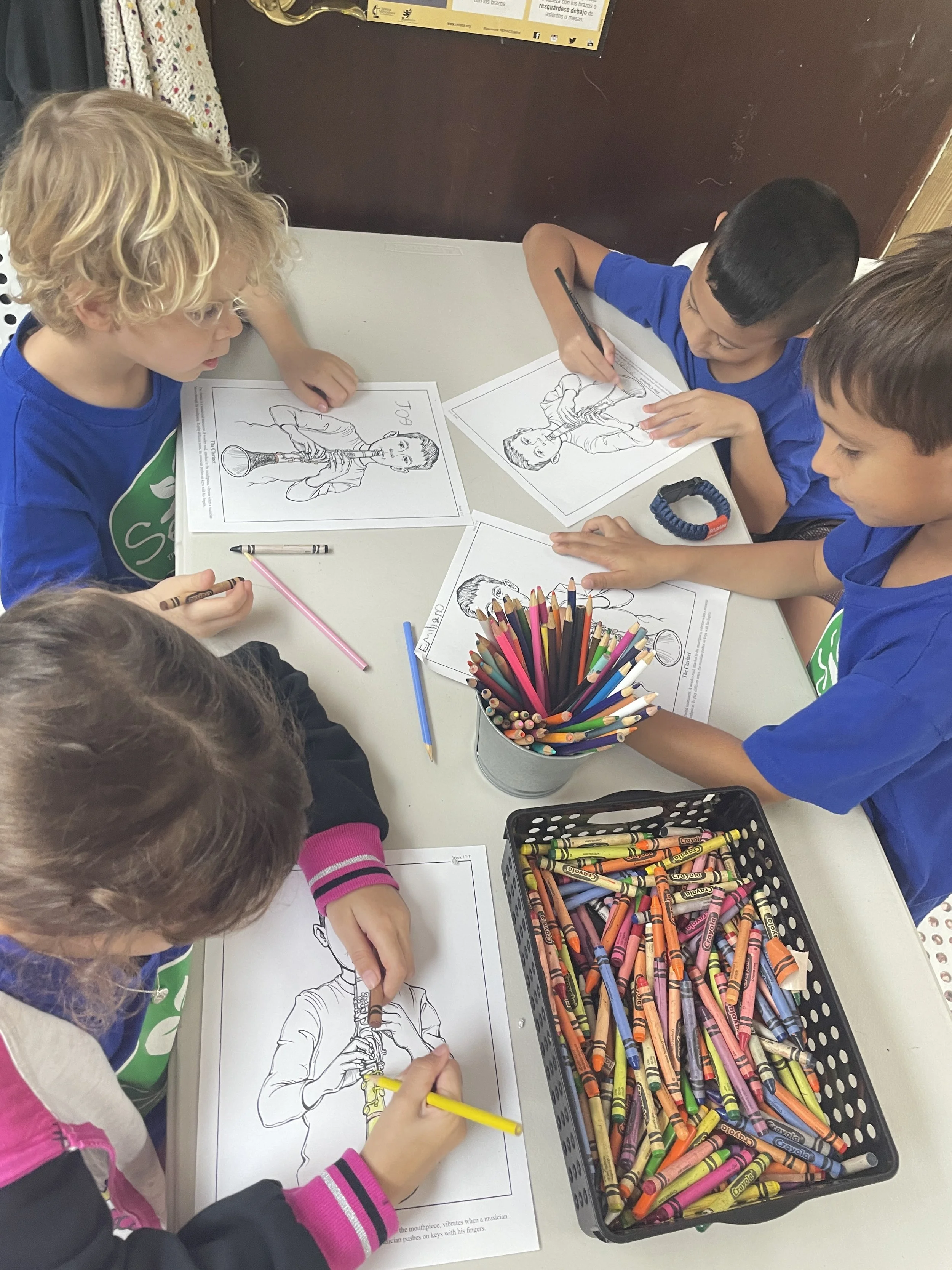 In studio time we learned more about the orchestra. This week, the focus was on the woodwind instruments. We enjoyed a beautiful clarinet concerto by Mozart while coloring in a sheet for our binders.