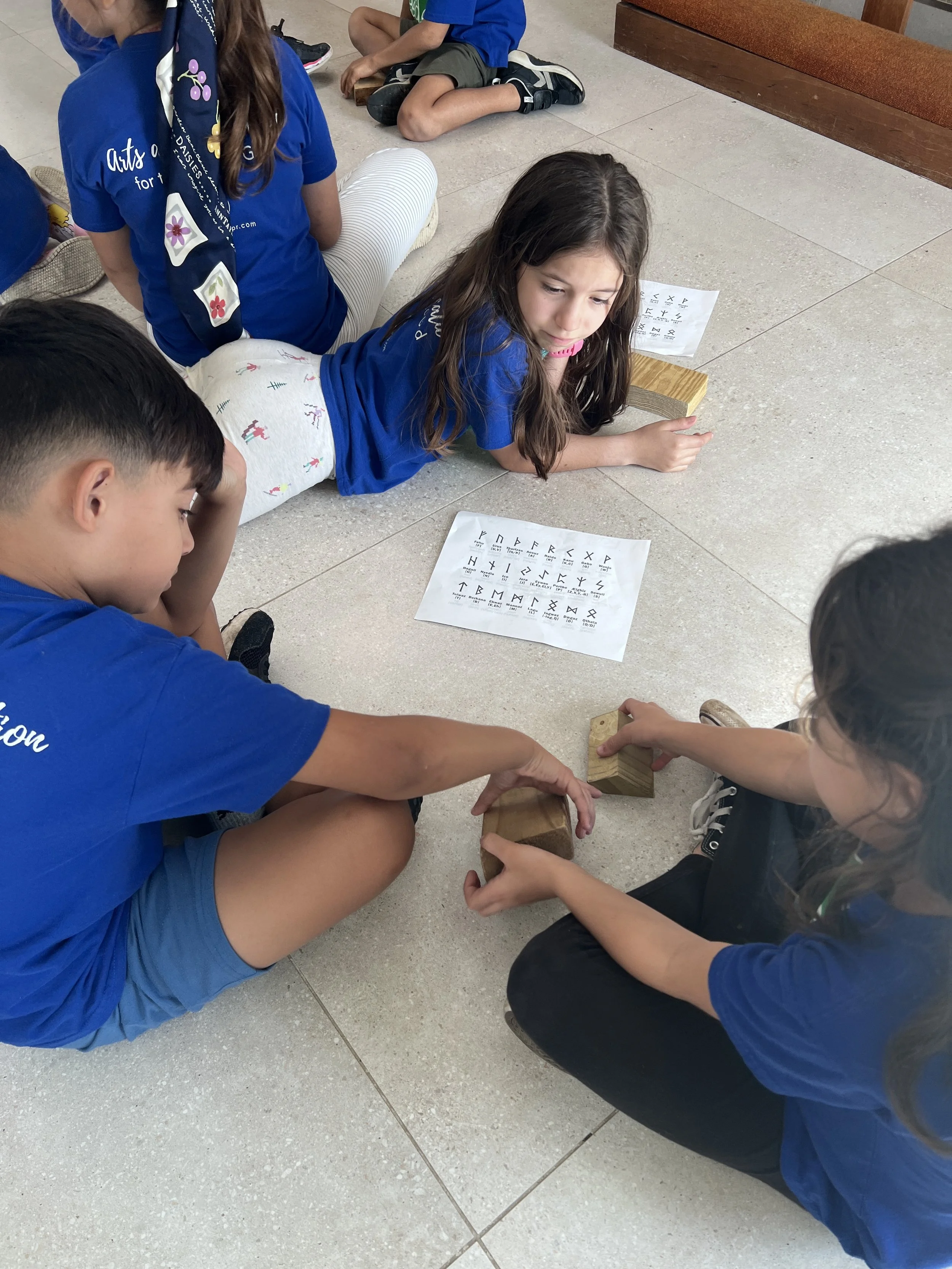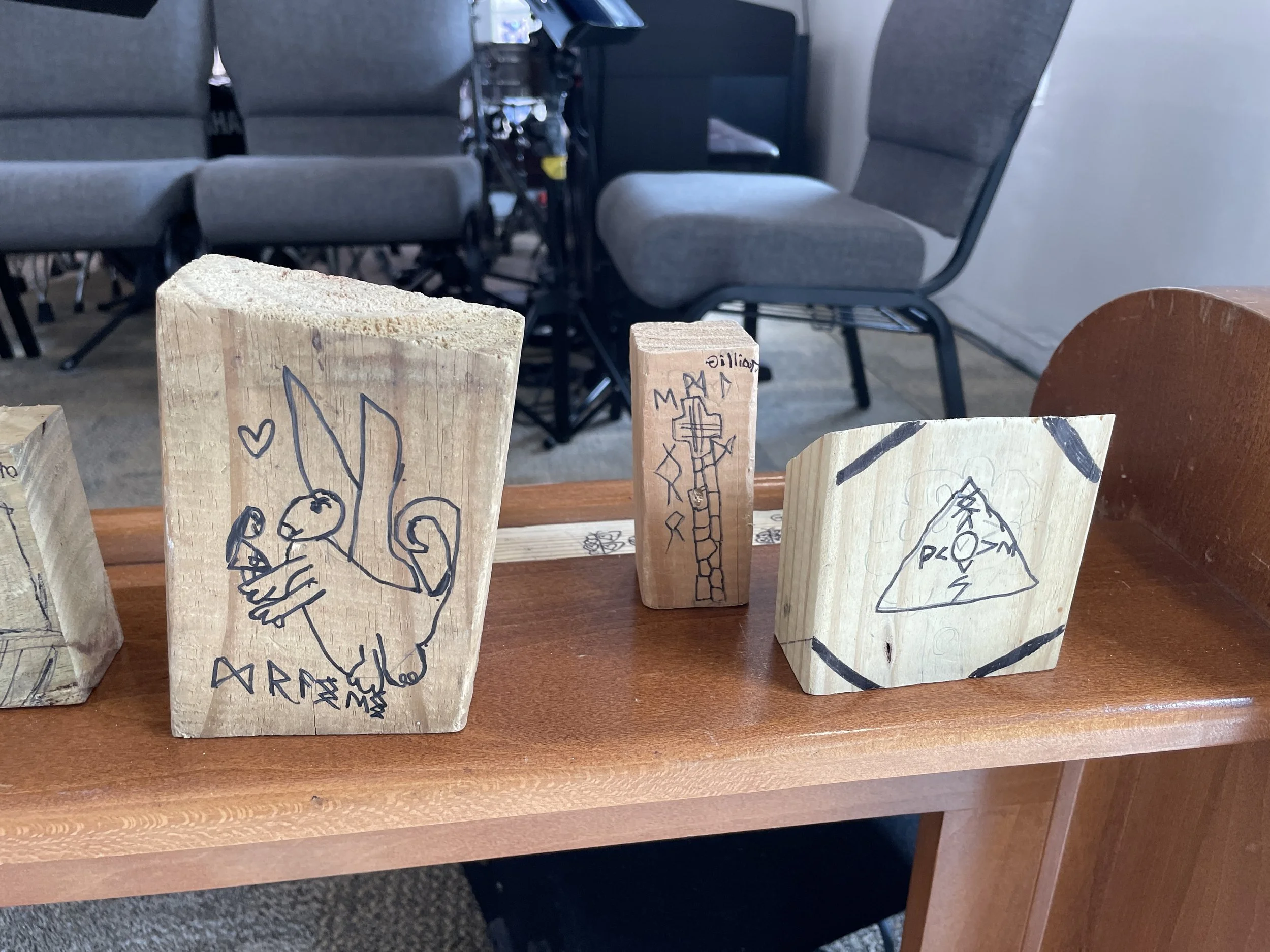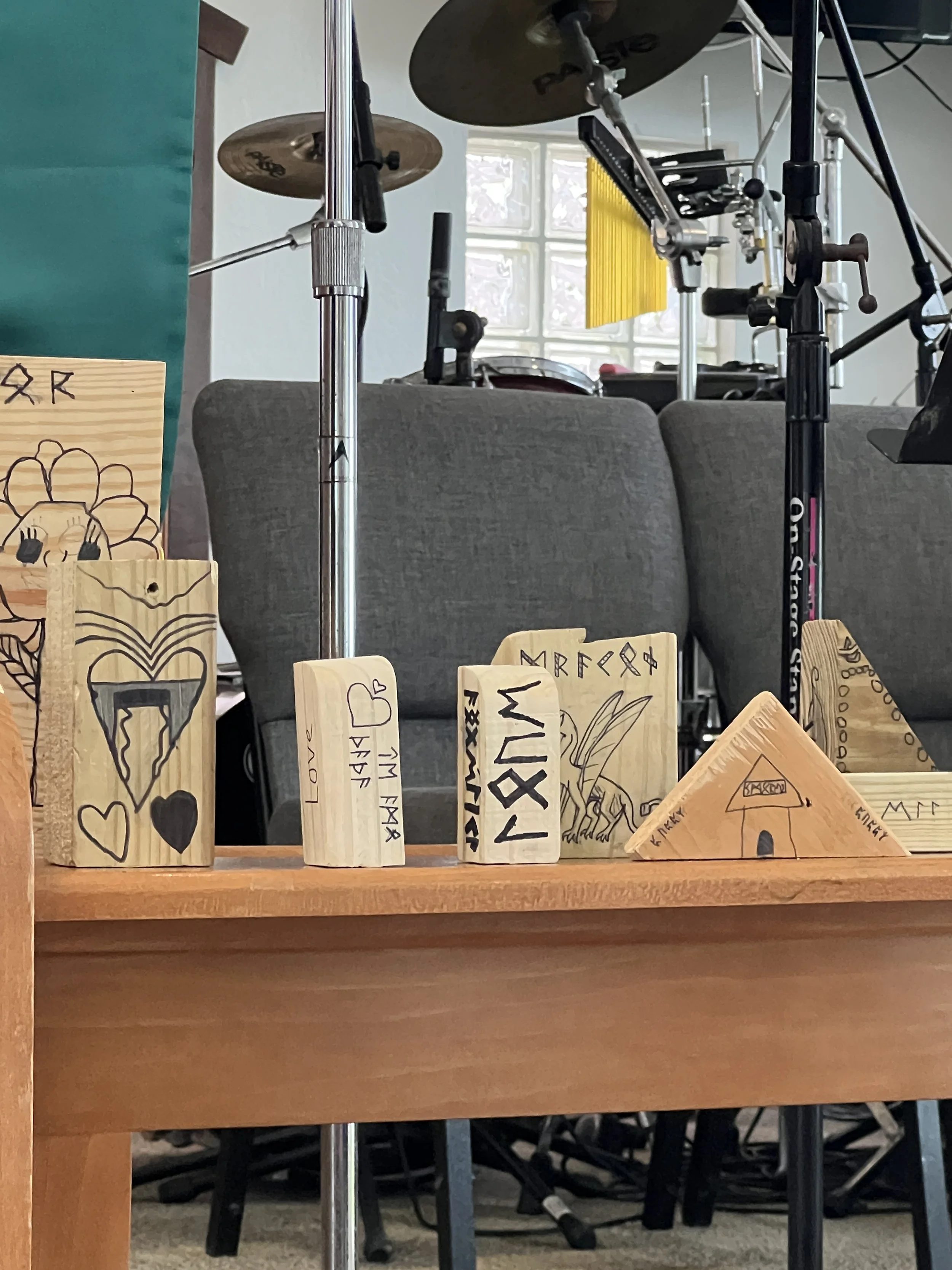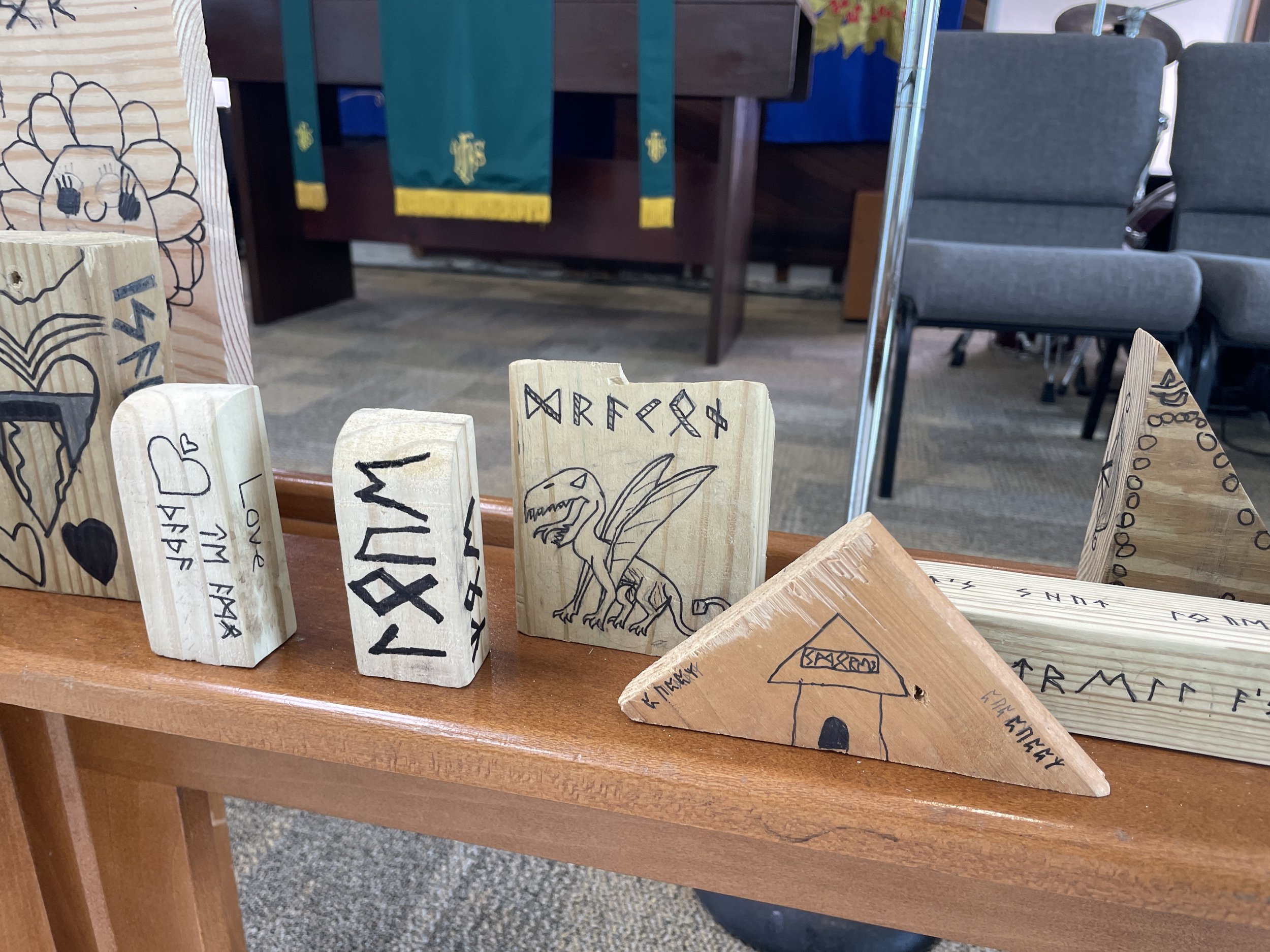 In our studio time the students were able to create their own Viking runestone. Since Vikings made these in stones and wood, we brought in many different pieces of wood for them to choose from. We encouraged them to think of a design that went with the shape of their piece of wood. We gave them pictures of different designs and of the Viking letters for them to be inspired as well. First, they drew their design in pencil and then they went over it with a black flair pen. We did this as a full group activity and listened to music from Mozart in the background as the children worked quietly. When finished, they went outside to pretend to be on a viking ship led by Mr. Jared.