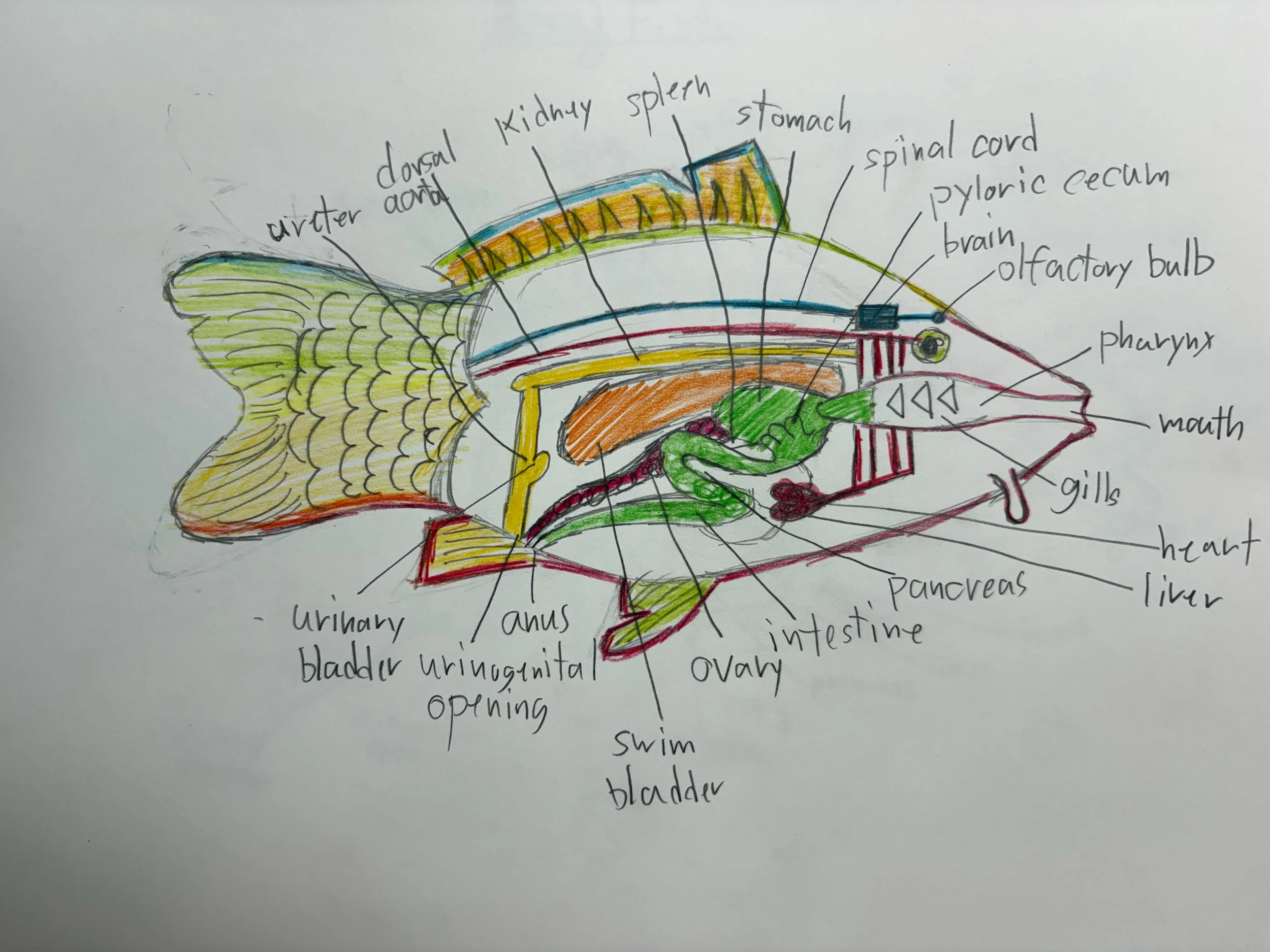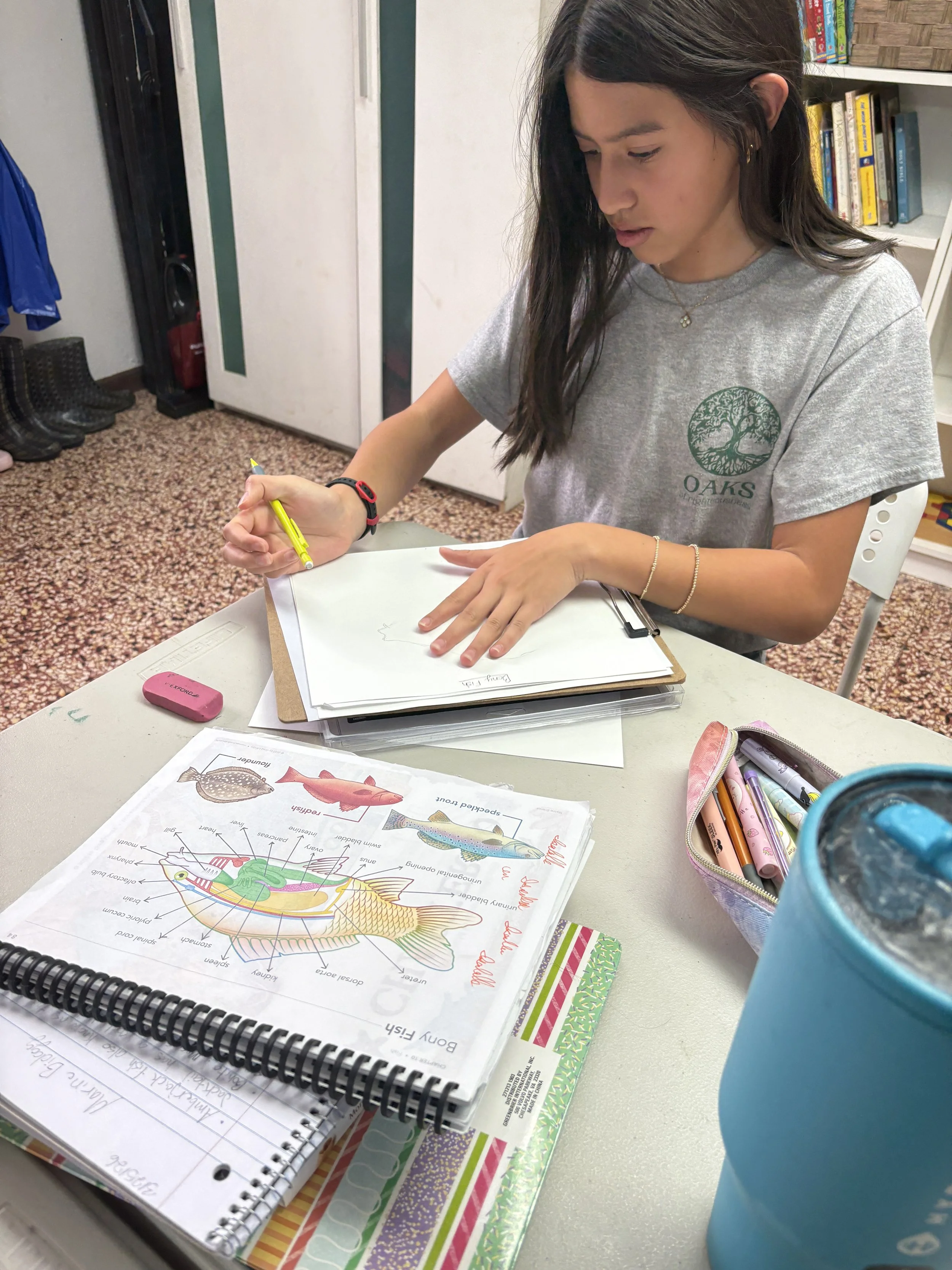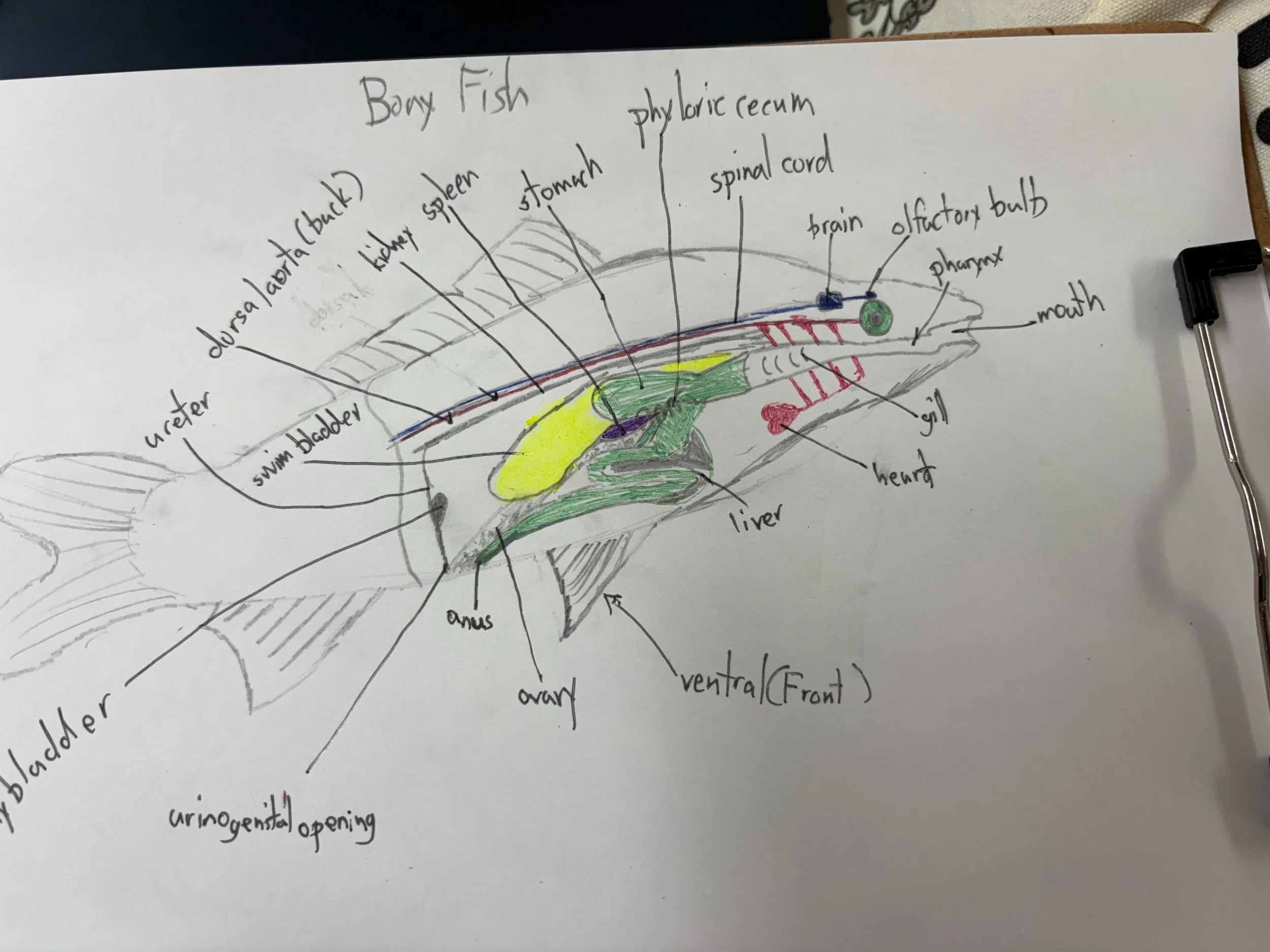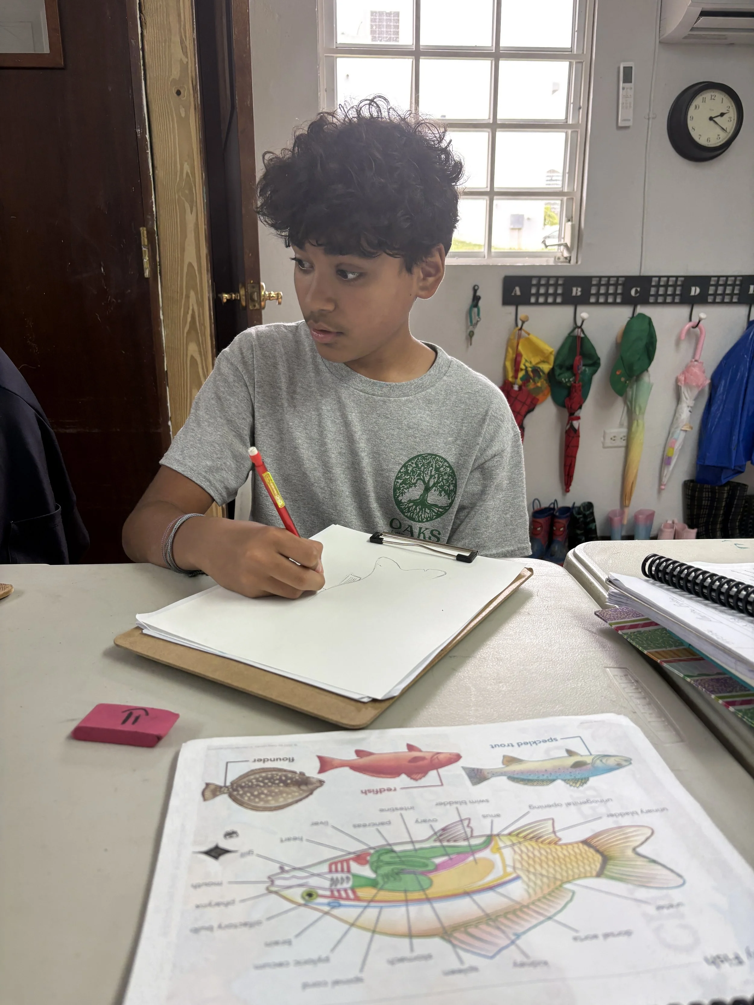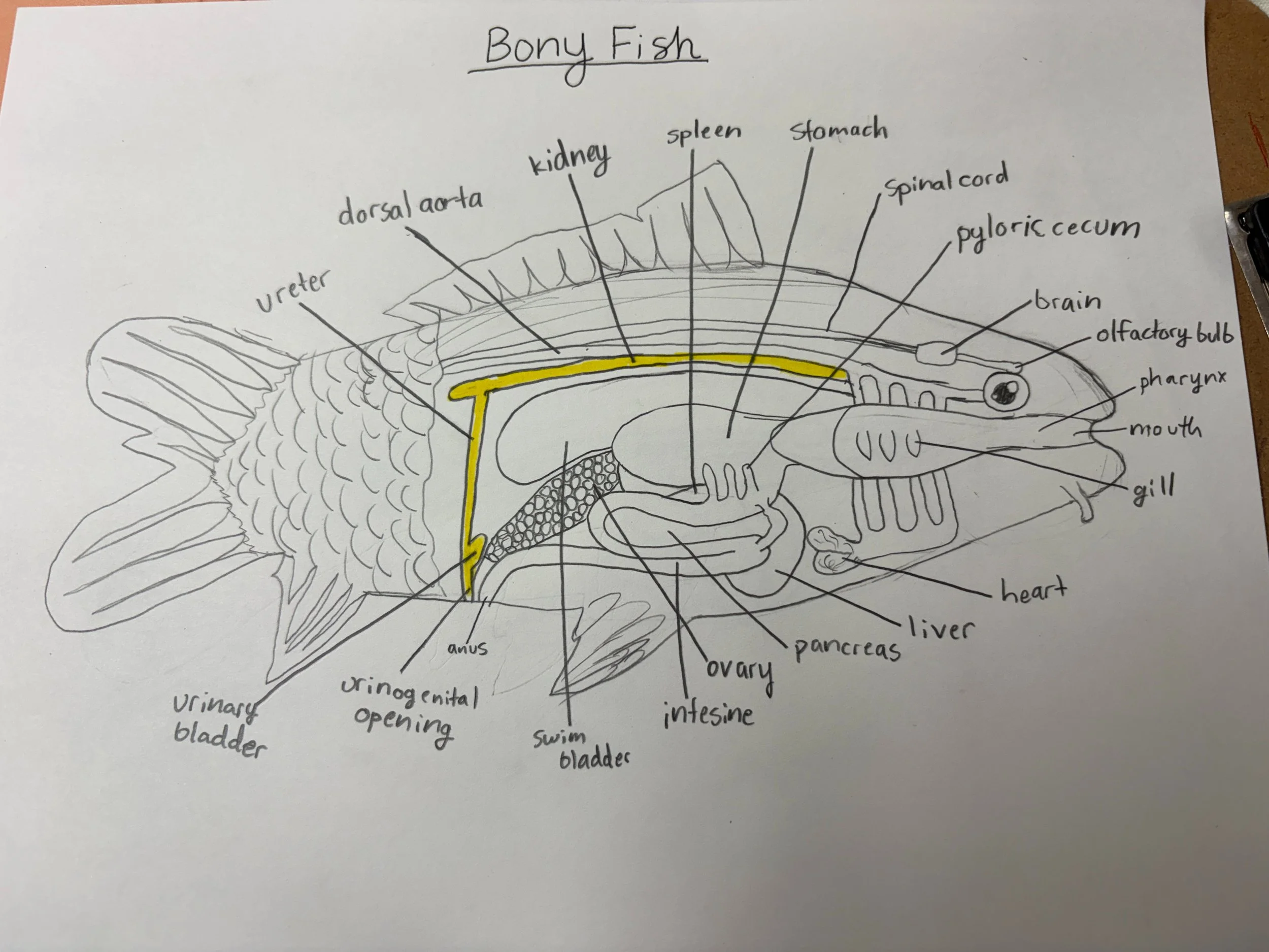 In Marine Science, the students learned about bony fish anatomy and physiology. Examples of bony fish are grouper, yellowfin tuna, and red snapper. One special organ that God gave bony fish is the swim bladder, which allows the fish to control the depth at which it swims by either inflating or deflating it. In preparation for their in-class dissection of a bony fish, the students worked on sketching and labeling a diagram of a bony fish and all its internal and external parts.