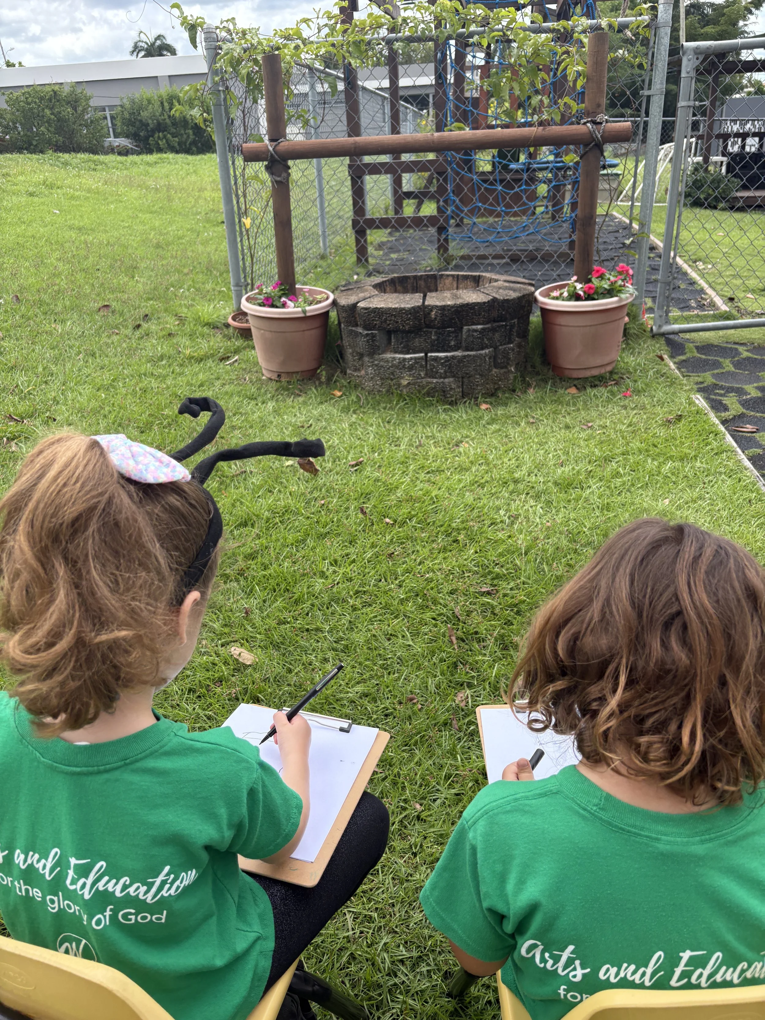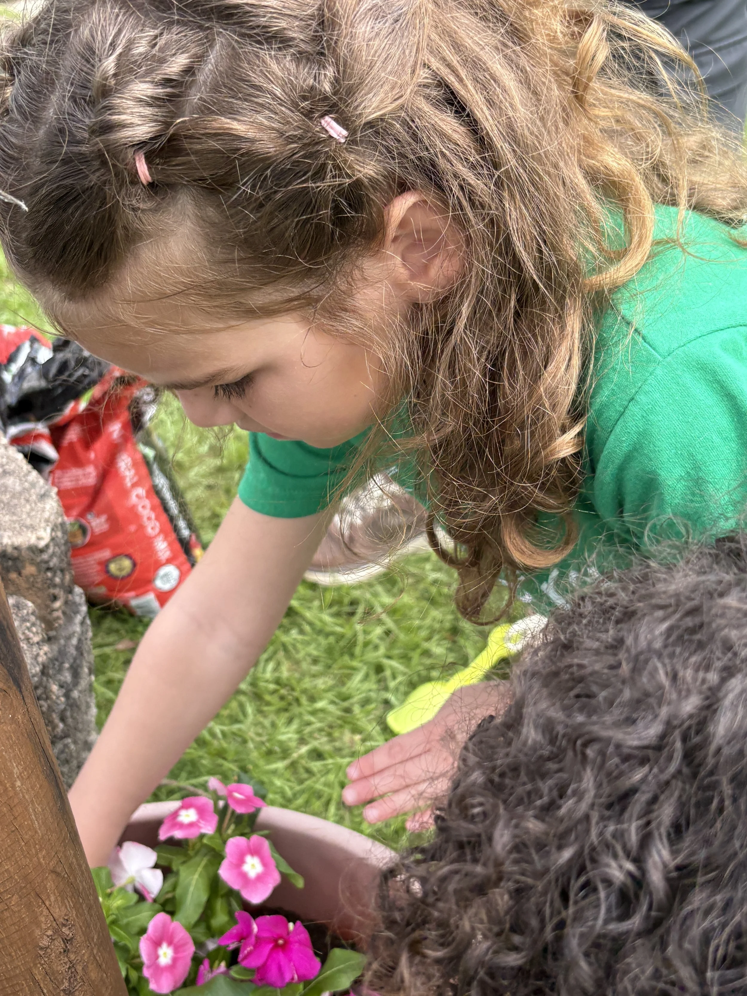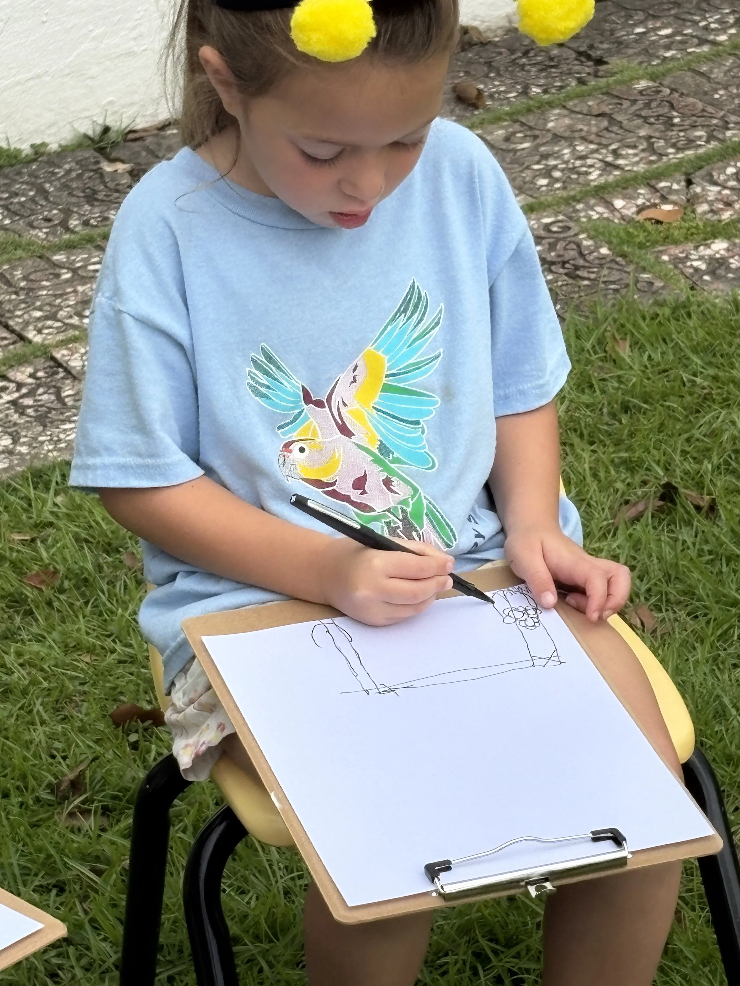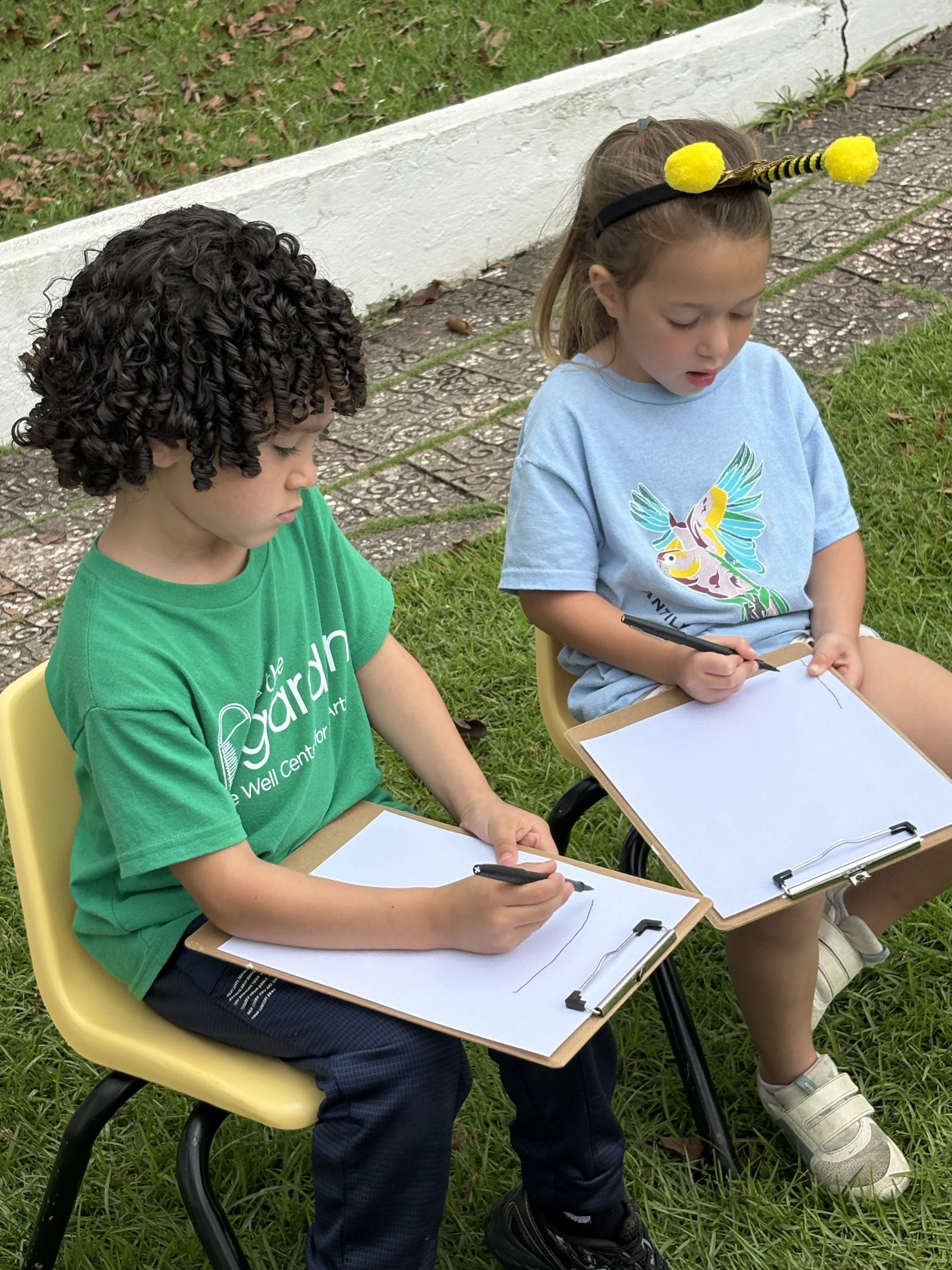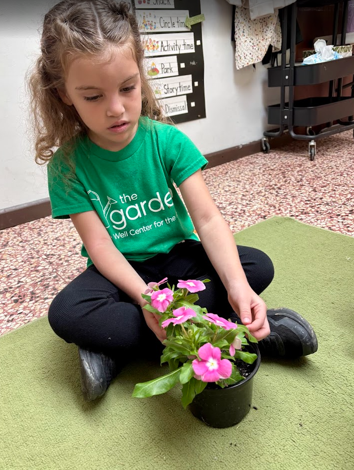For activity time, we got to plant flowers by the well for the bees to enjoy. It was so much fun working with the soil and seeing the flower roots as we carefully pulled them out of their small pots to transfer them to a larger pot outside. We also went outside to look at and draw a picture of the flowers we planted by the well. It’s called observational drawing, where you look at something in real life (still life) and transfer it to paper. It’s great for improving hand-eye coordination. The kids really enjoyed doing this and took it very seriously.