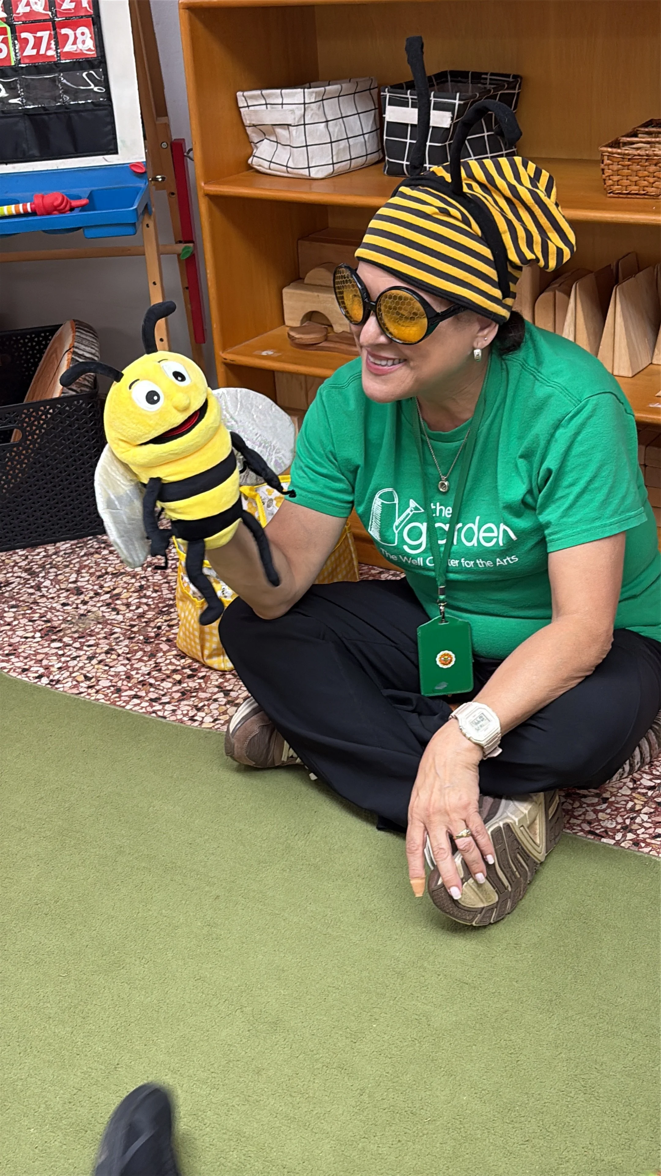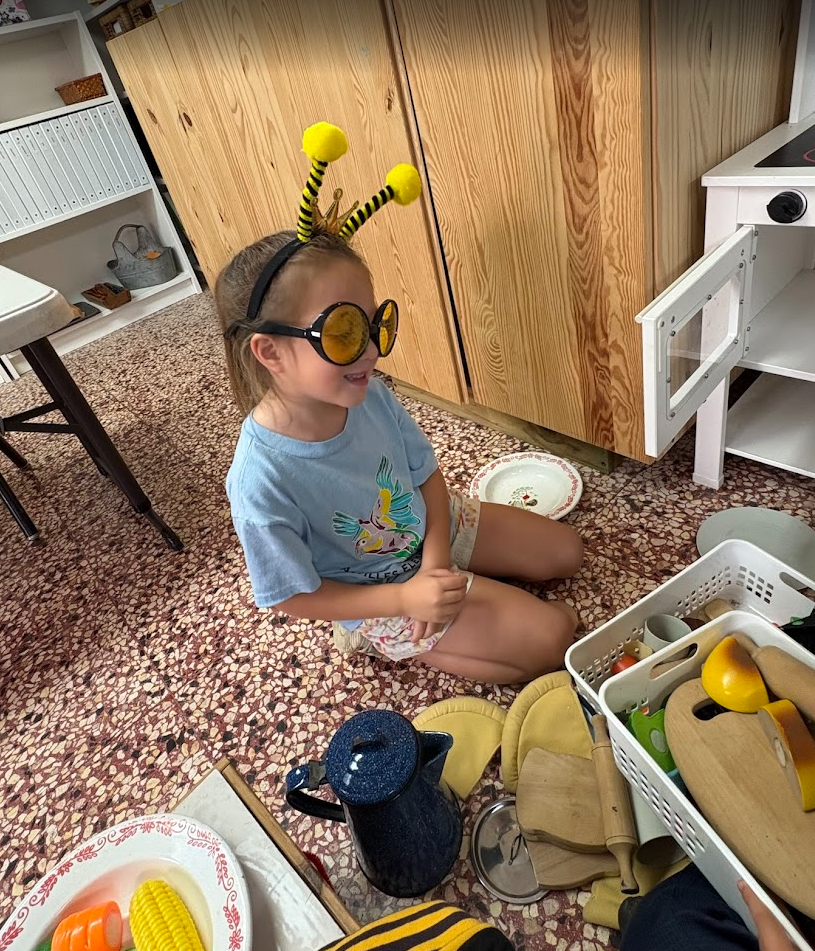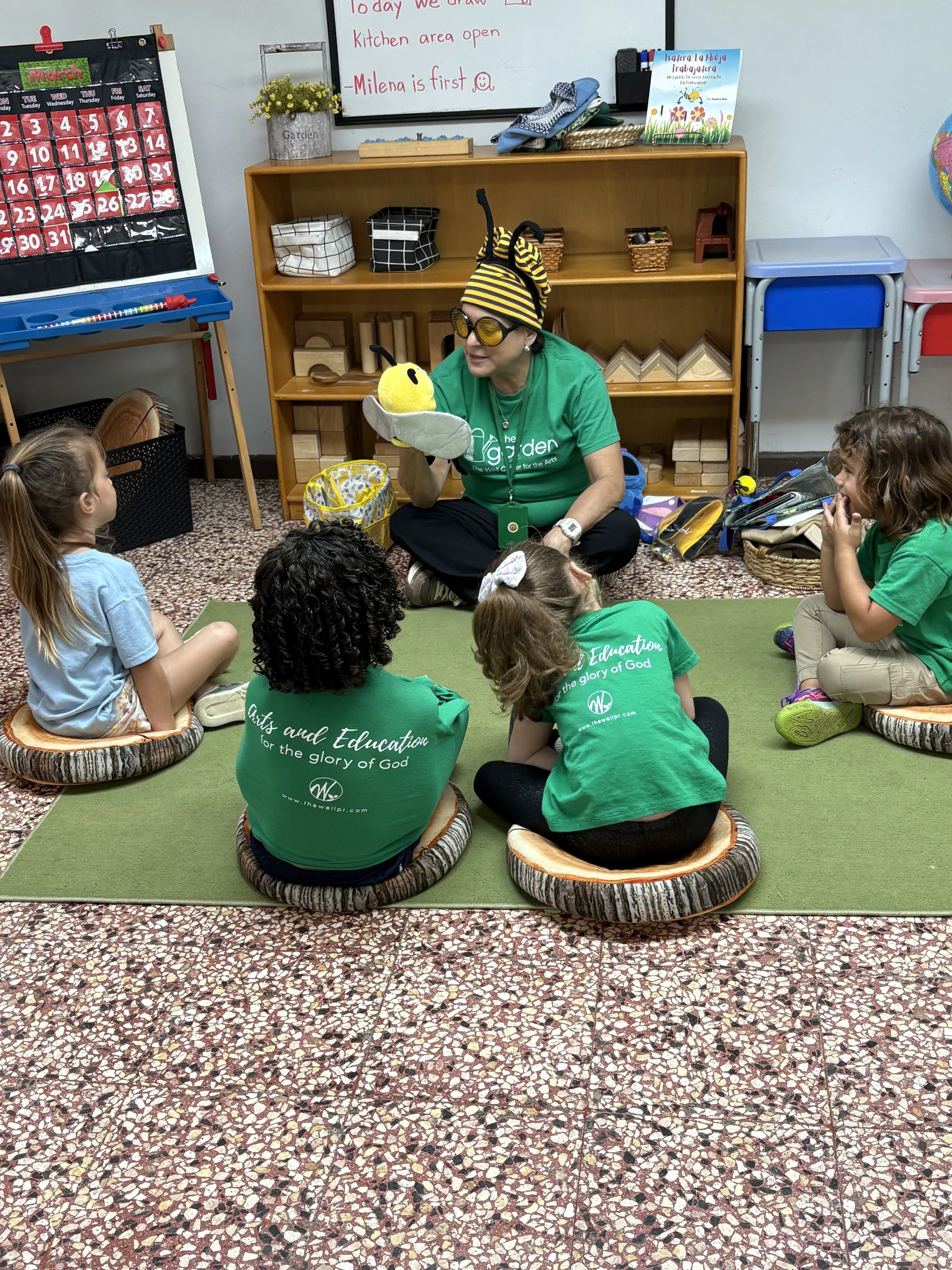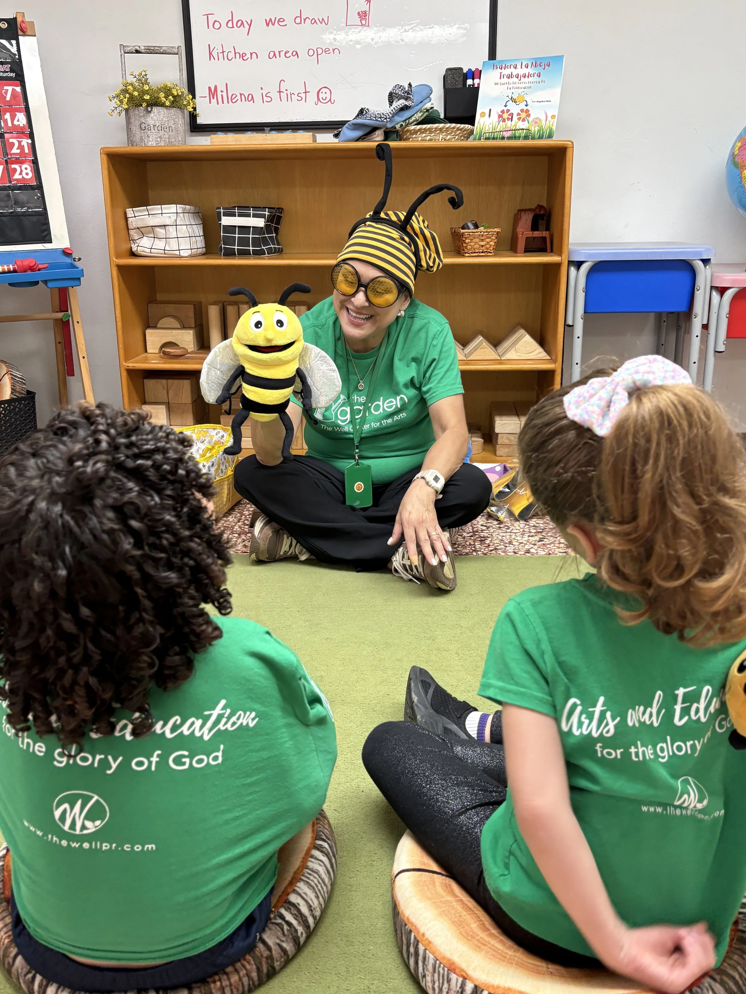 At circle time, we continue to learn about bees with our puppet friend Bobby Bee and his little brother Billy, who brought his friend Daisy Flower. Did you know that a bee’s buzzing sound does not come from its mouth? They make it by flapping their little wings. They also taste and smell through their antennae and how sometimes bees cover their entire bodies with pollen. We can see how God made these insects so special just like us.