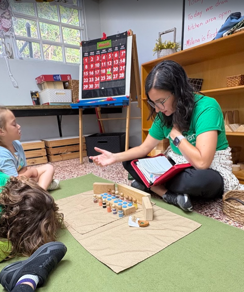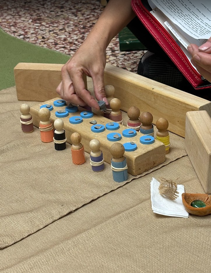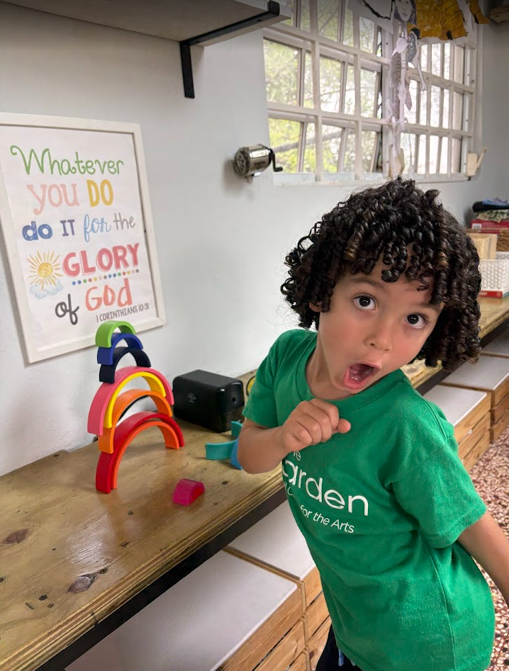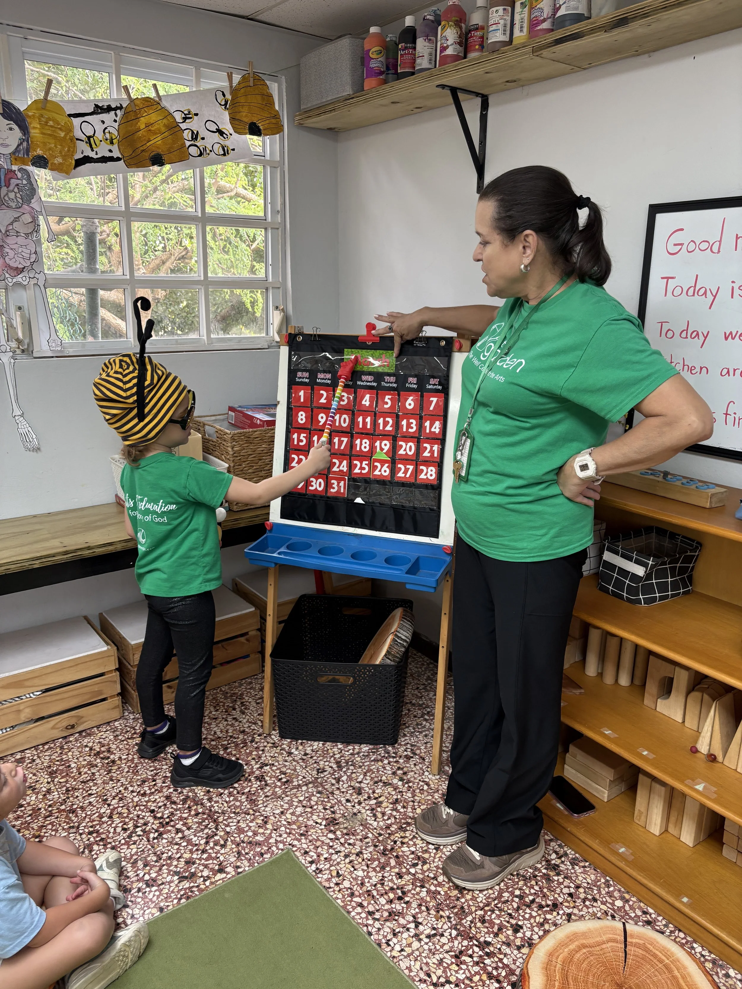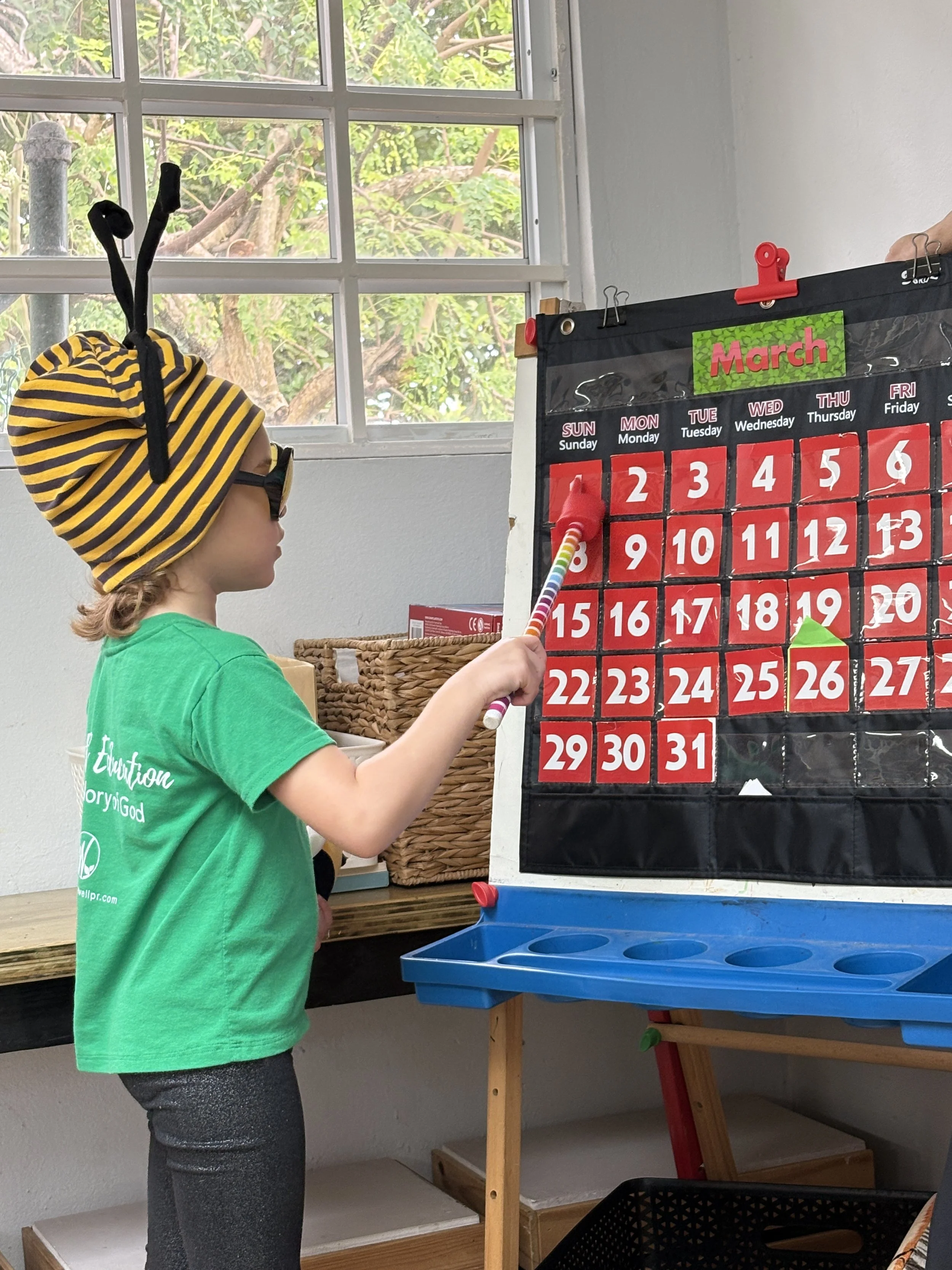 At circle time, we continue to learn about bees with our puppet friend Bobby Bee and his little brother Billy, who brought his friend Daisy Flower. Did you know that a bee’s buzzing sound does not come from its mouth? They make it by flapping their little wings. They also taste and smell through their antennae and how sometimes bees cover their entire bodies with pollen. We can see how God made these insects so special just like us.
