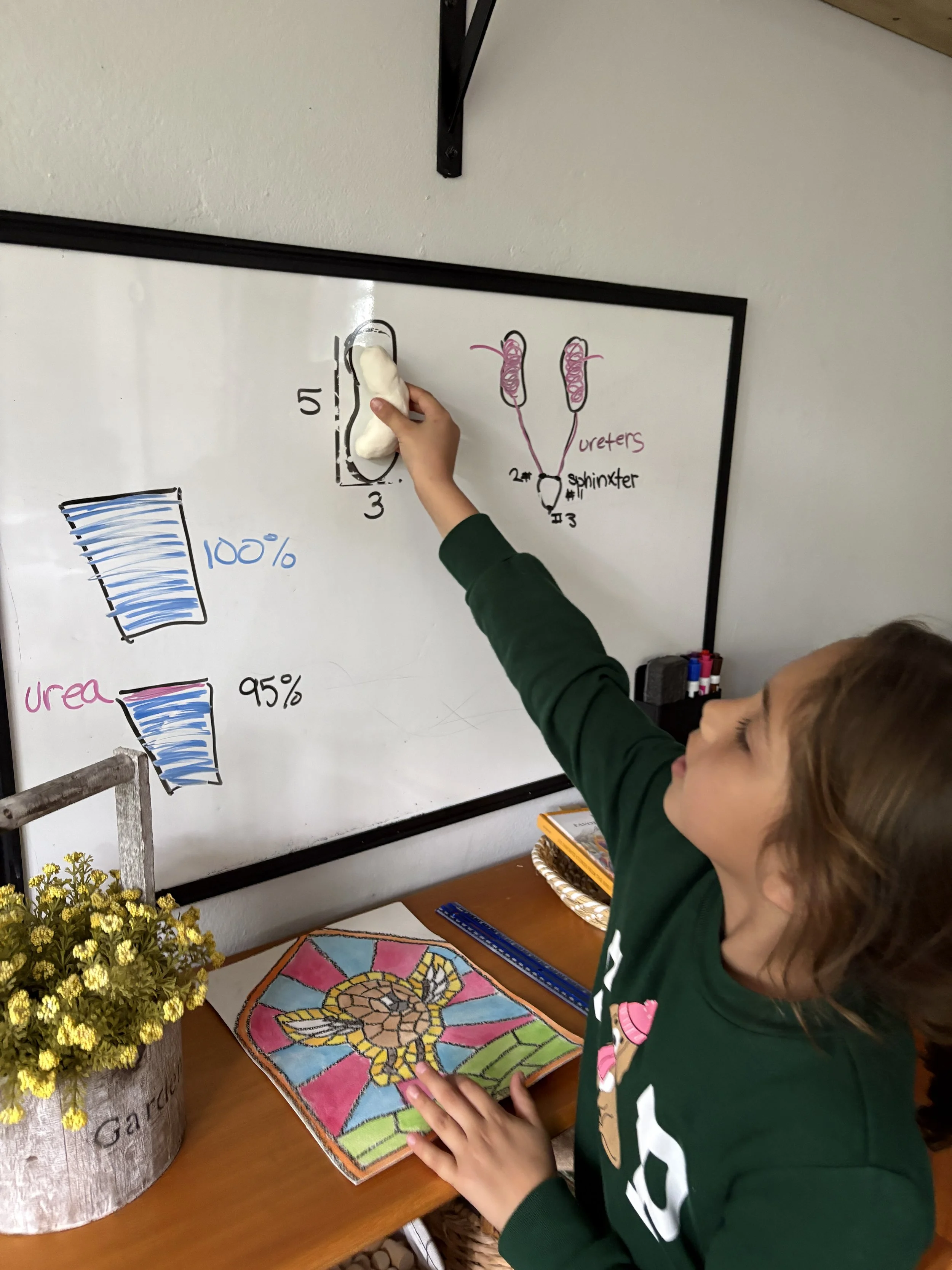 We are almost at the end of our study of the urinary system. Last week, we learned what the kidneys, ureters, and bladder do. We learned about the different sphincters in the bladder and how they work to hold in and relax to let out the liquid through the urethra. We enjoyed sculpting the parts of the system with play doh, especially trying to make a kidney the shape and size of an actual kidney (approximately 3 inches by 5 inches) and the length of a ureter (approximately 9 inches long).