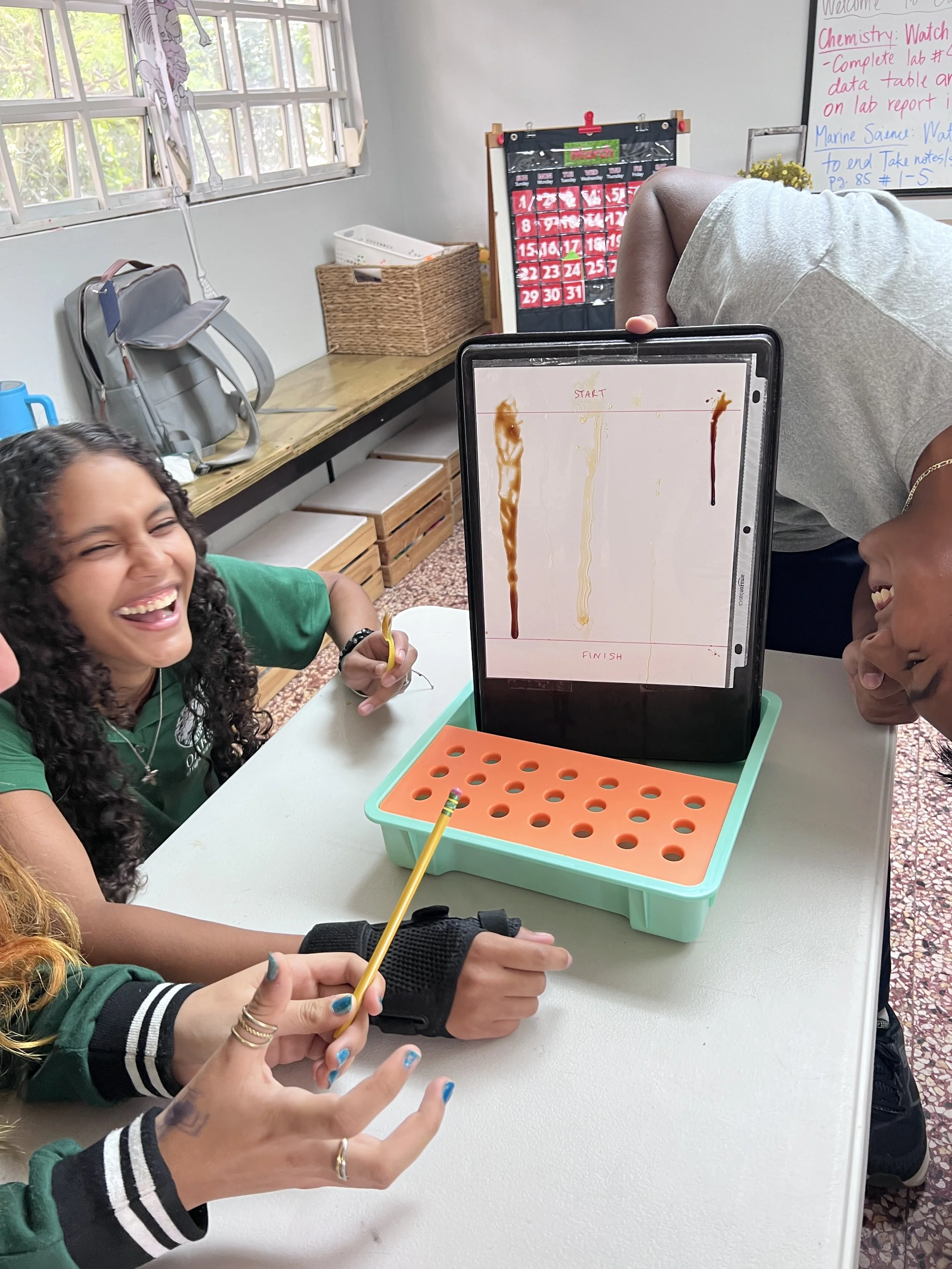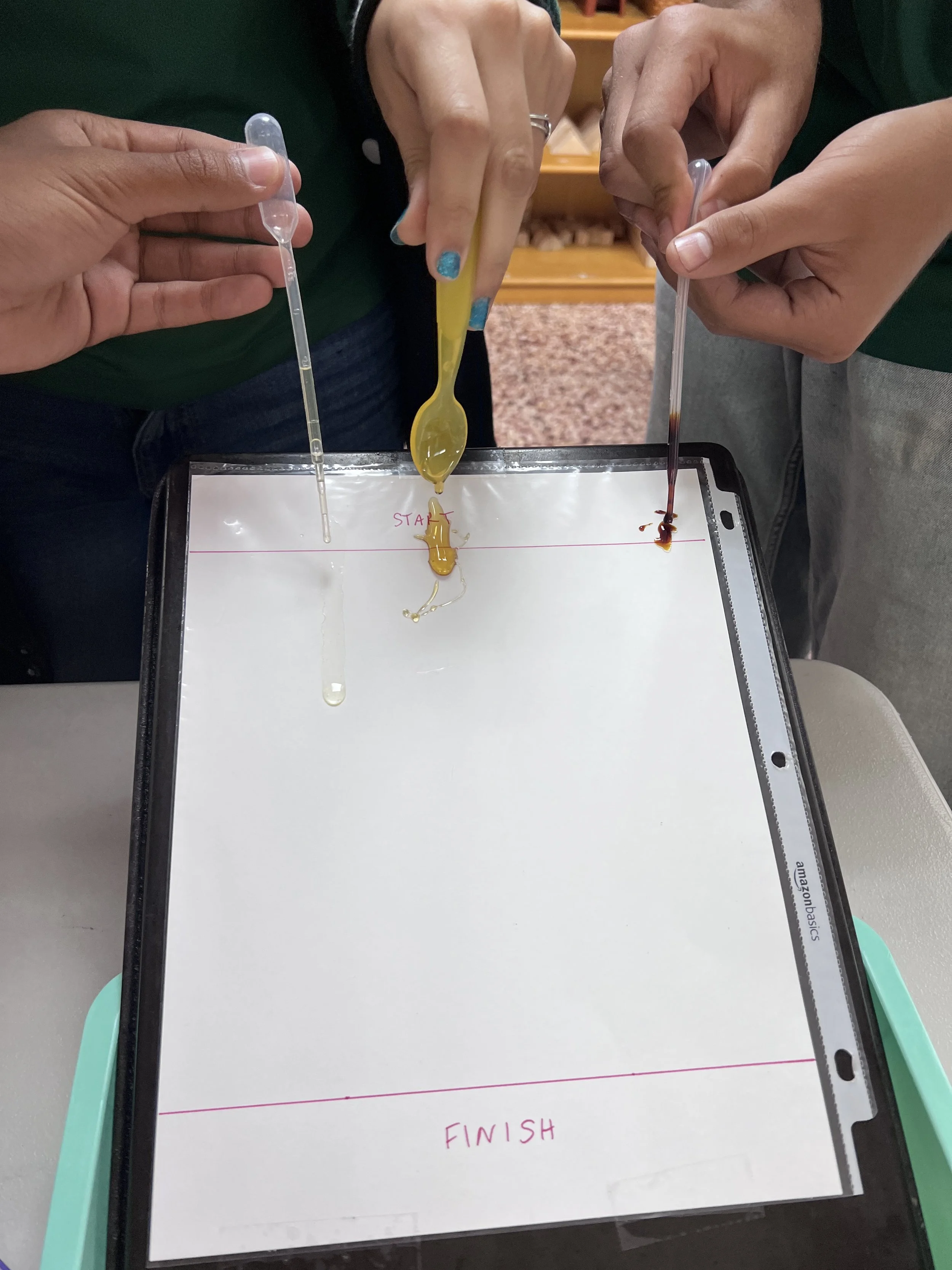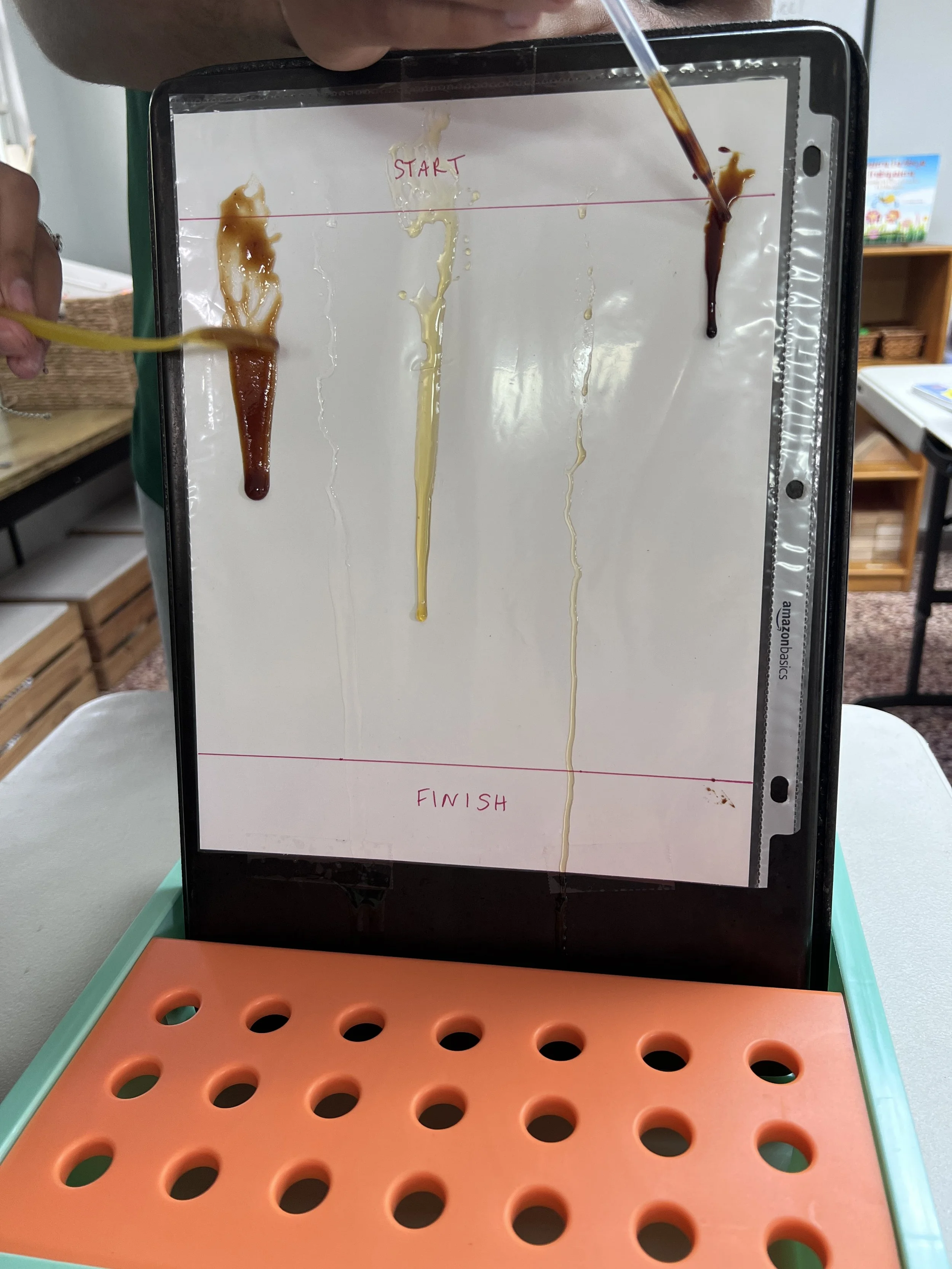 In Chemistry, the students learned all about viscosity--the measurement of the internal friction or resistance to flow of a liquid. To explore the concept more, we conducted a viscosity race in which the competitors were molasses, honey, maple syrup, dish soap, barbeque sauce, and avocado oil. Molasses won the prize of having the slowest flow and highest viscosity while avocado oil won the prize of having the fastest flow and lowest viscosity. The students also worked on a virtual viscosity lab in which they dropped a metal ball bearing into several types of liquids at different temperatures and calculated their viscosity scores.