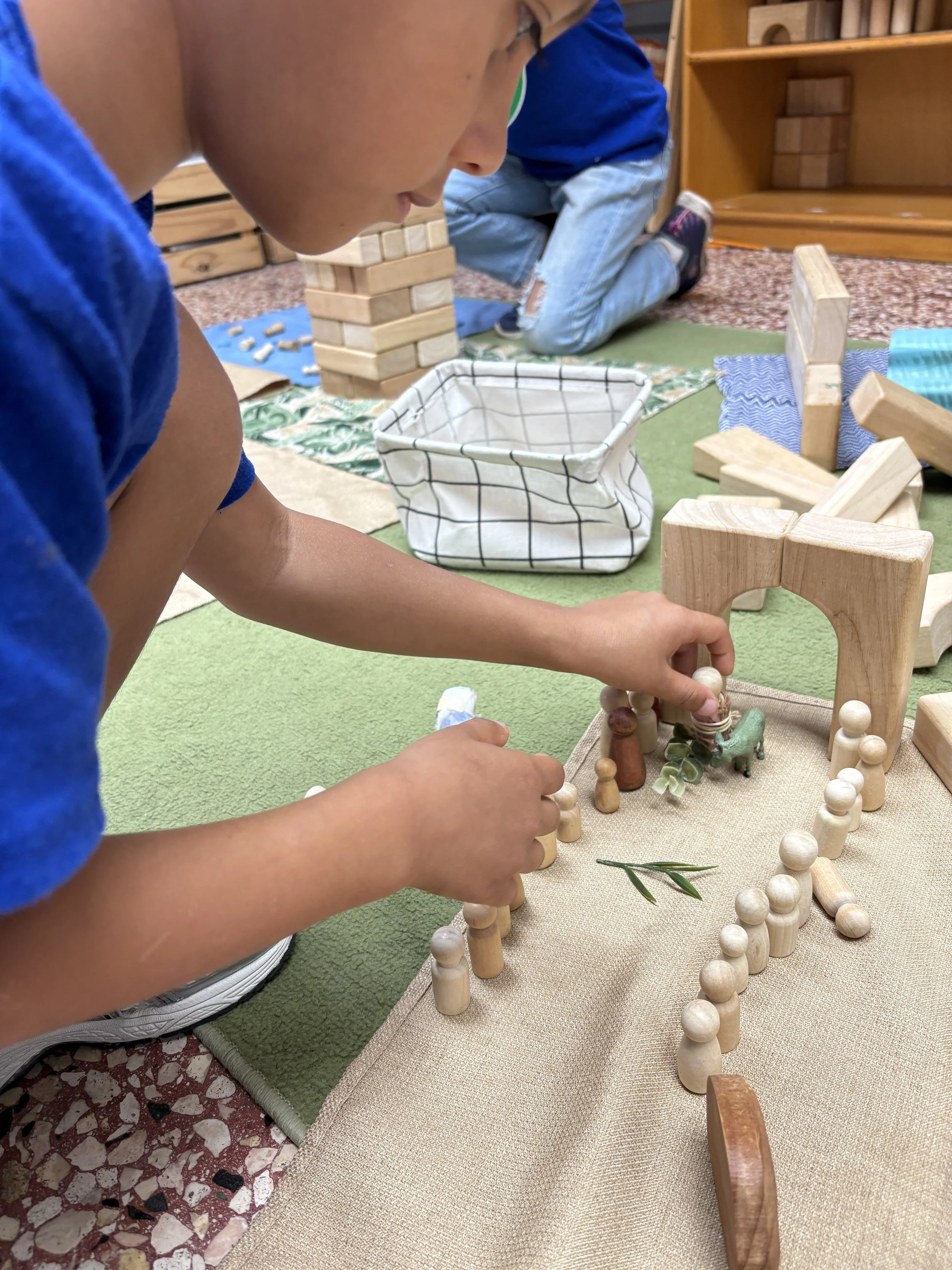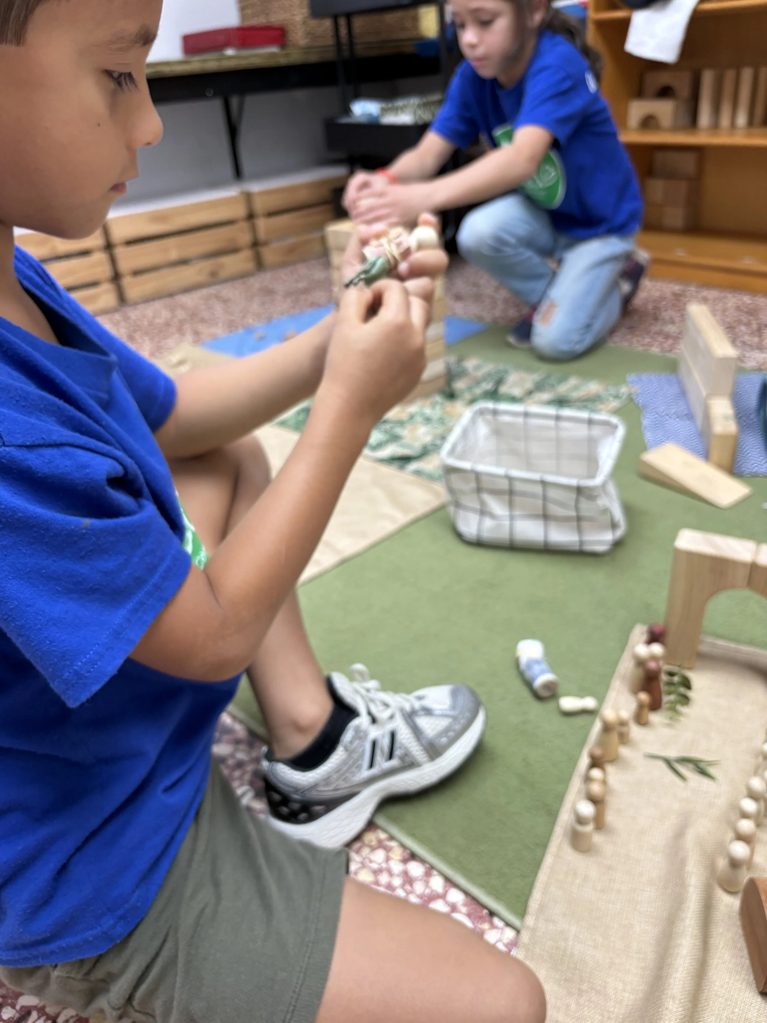 Activity time: We got to mix brown and yellow paint again to make a honey color. Then we painted a honeycomb inside our beehives. We used a honeycomb cookie cutter to make the hexagon shapes, and when it dried, we got to paint bees inside. We also played at the block center and used the wooden people to retell the Bible story we learned. We used the sensory tables too, and surprise—we found tiny bees inside to play with!