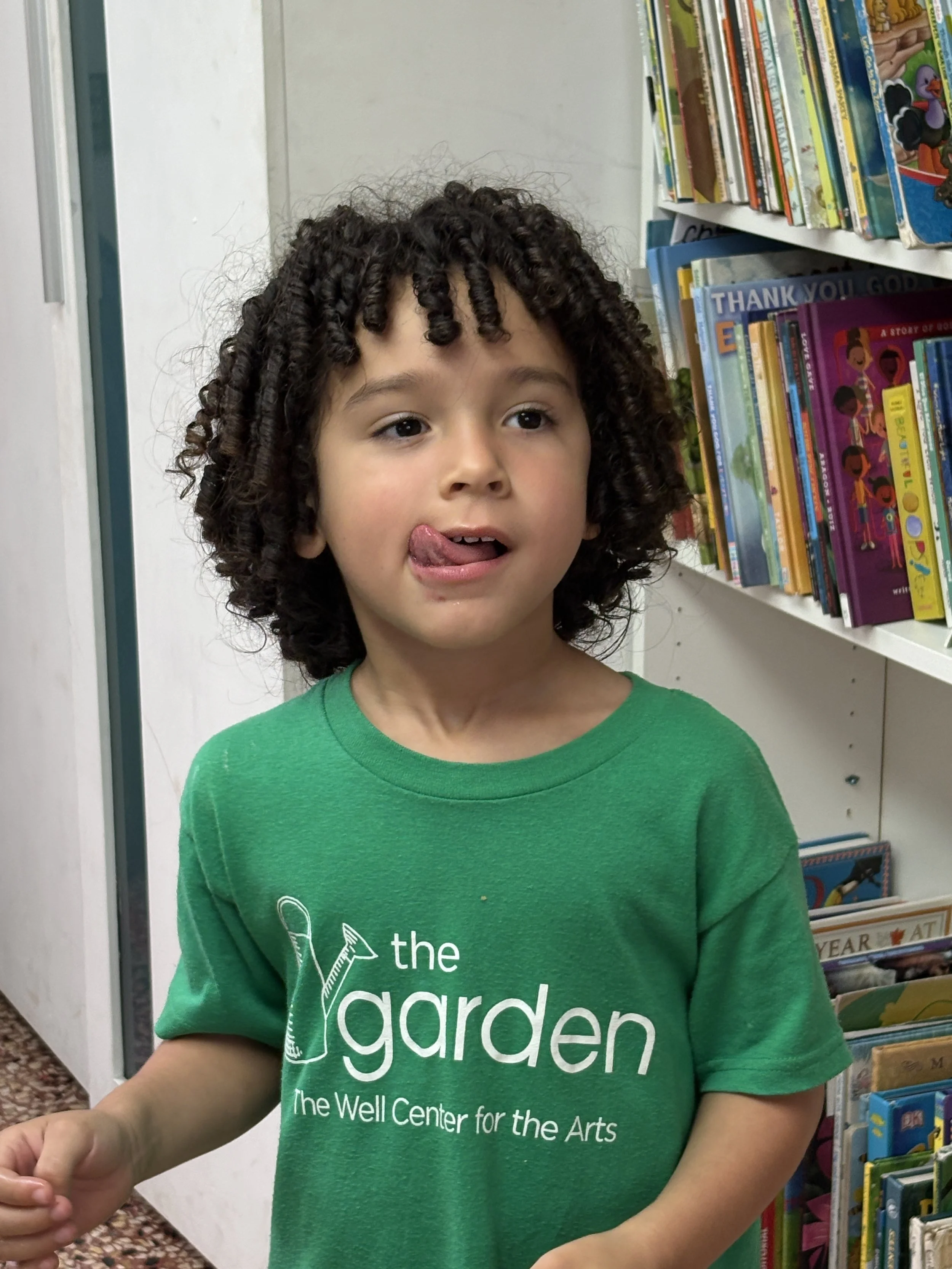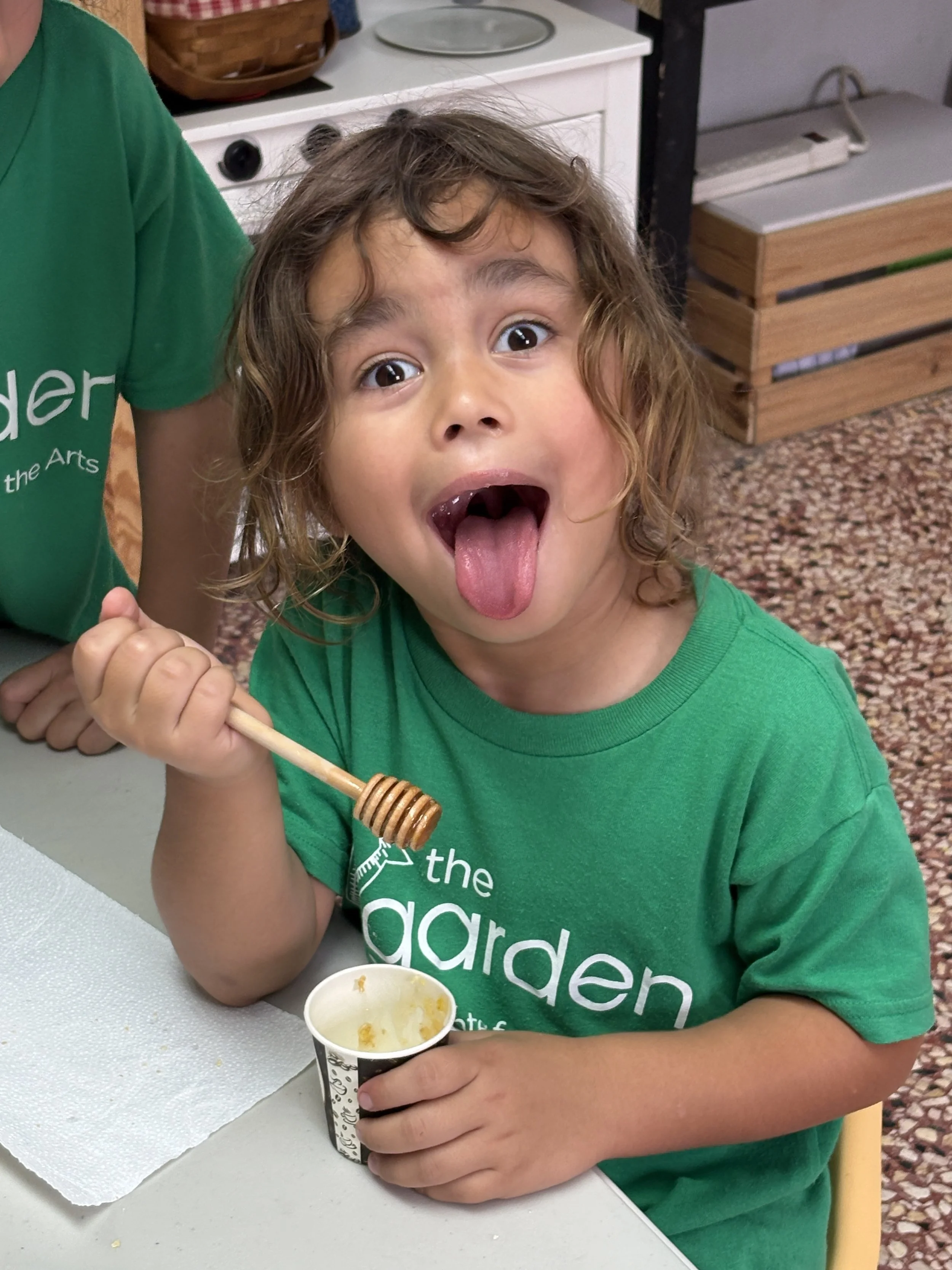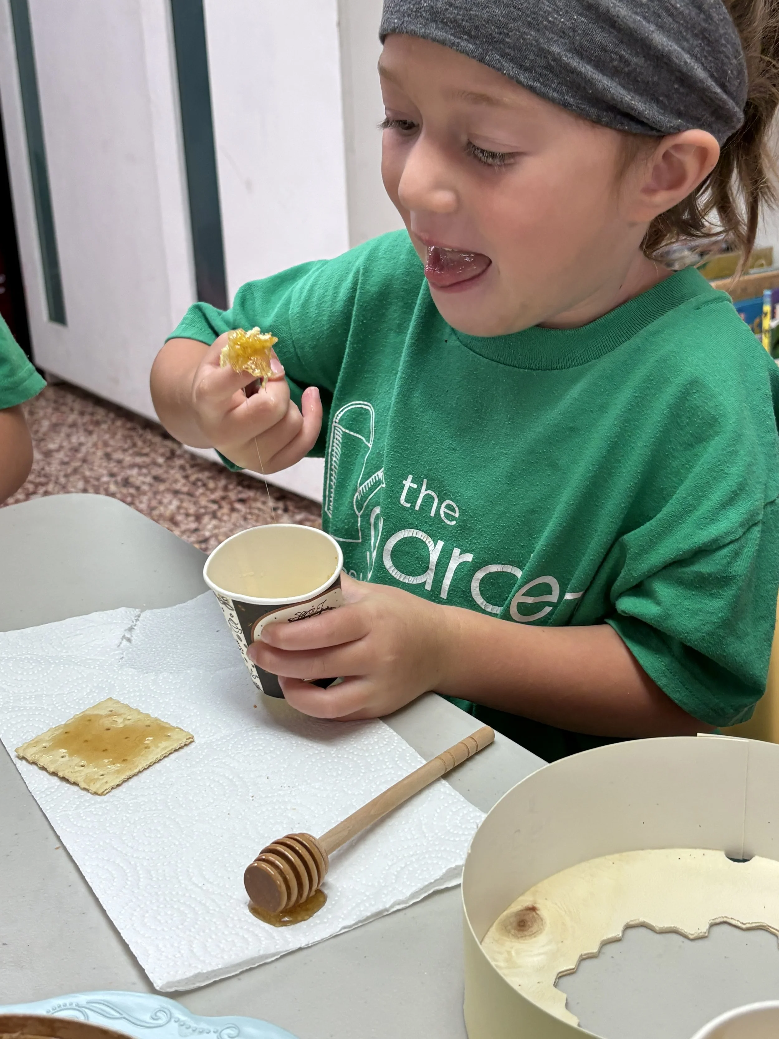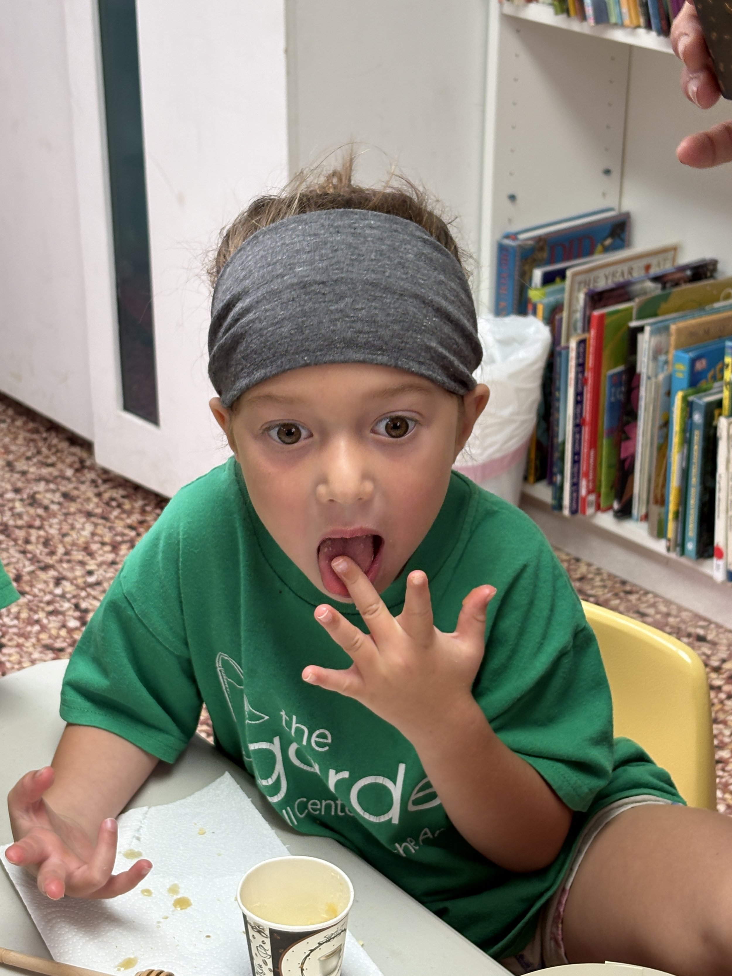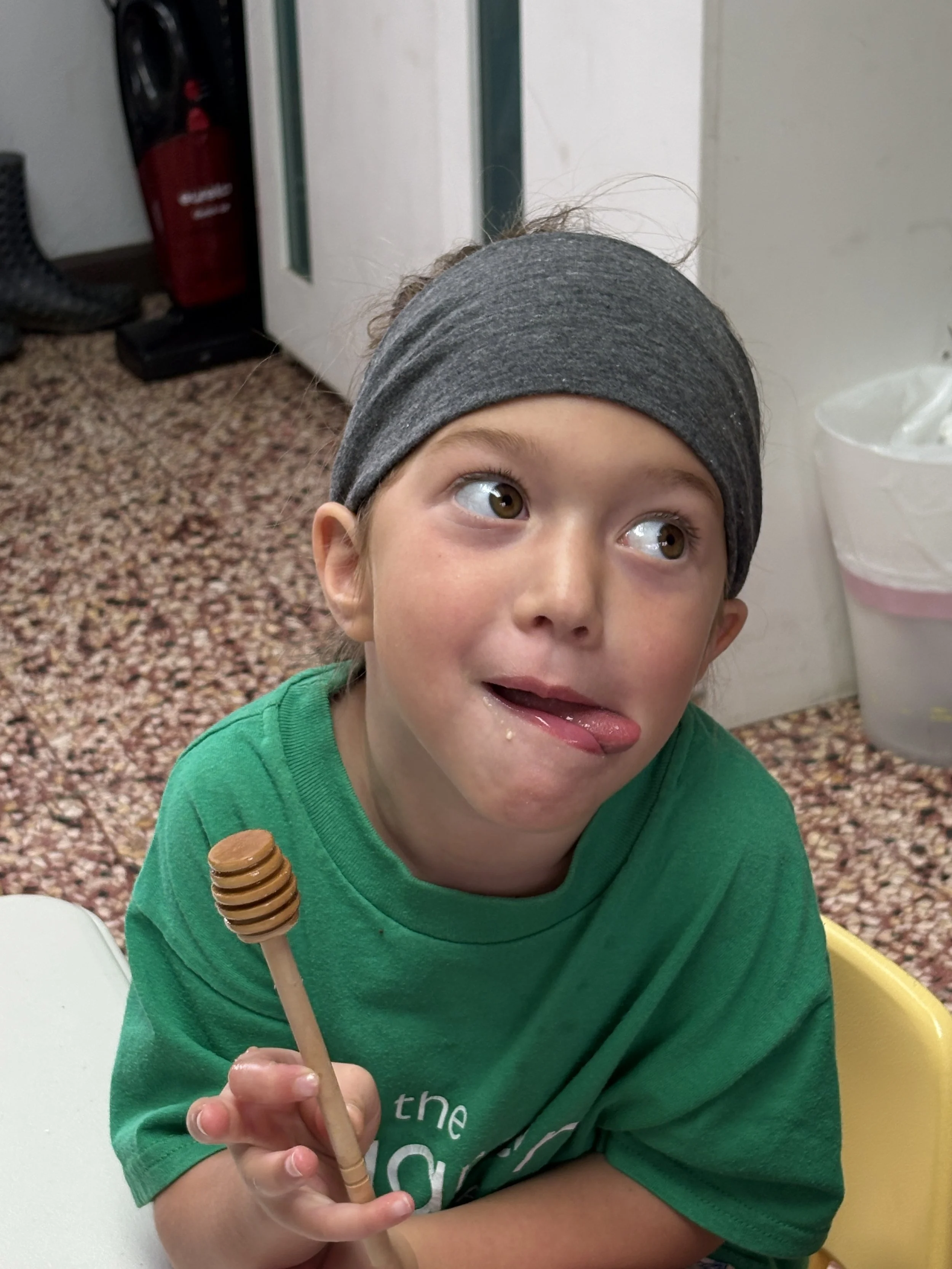 Isaiah is pictured here focusing intensely on his science project. This type of focus happened all over the programs this week, as the Oaks conducted experiments, the Seeds concentrated on a “Mona Lisa” project and the Garden kids continued their study on bees and especially…honey (yum!).